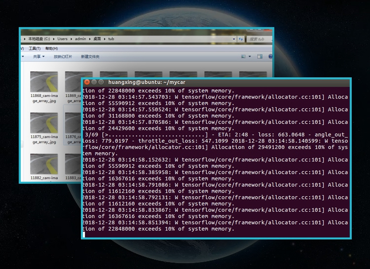 - Secondly, deal with its training data. During the whole training, data such as pictures, throttle, angles will be stored in board for Raspberry Pi. Please copy those information into your computer. After coping with these data, copy your file into the board for Raspberry Pi. Then place the car in the track for self-driving.