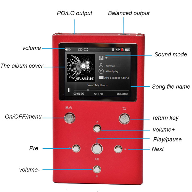 6.New Functions: Automatic shutdown, sleep shutdown customization, 3 Favorites, built-in EQ or custom 7 equalization (8HZ-16KHZ), return key customization (long press to turn the screen off, change songs or back to the main menu), supporting files cycle, car mode, random algorithm, multi-level directory, 9999 songs management, etc. Pressional audio processing DSP chip out-rivals STMF4 and STMF7.