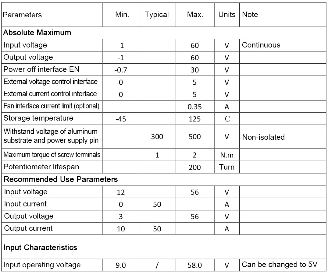 - Input and output within 30V, and 50A is supported