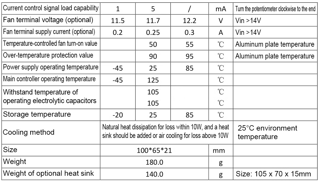 - Output current adjustment range: If the input power is sufficient, and the output power supply is 20V and a 0.4Ω resistor is connected to adjust CC potentiometer, the output current can be adjusted to a maximum of 50A, but cannot be adjusted to the minimum limit value (except 0A).