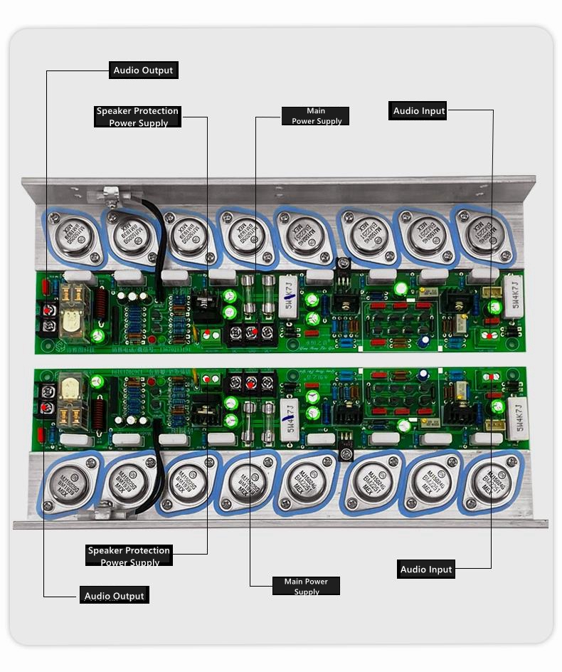 - Using original imported ON metal encapsulated transistors (16 pieces), HIFI power amplifiers have high power, good sound quality, warm and soft sound. Amplification has stable static working points, suppresses zero drift and other displacement points, non-destructive amplification, and restores true sound.