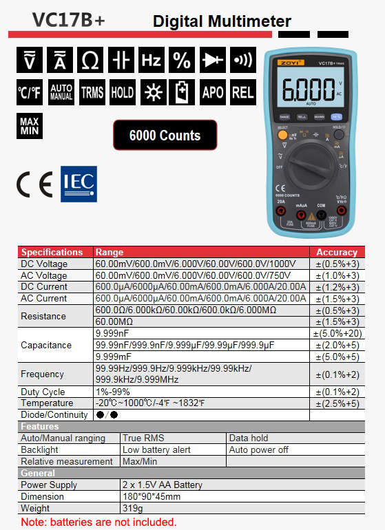 VC17B+ is a automatic / manual ranging digital multimeter using double-integral style A/D transform as the core.
