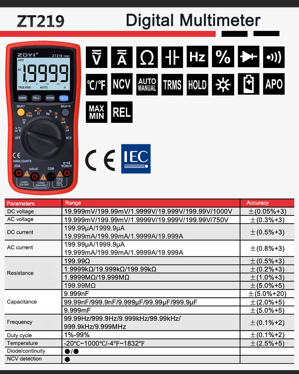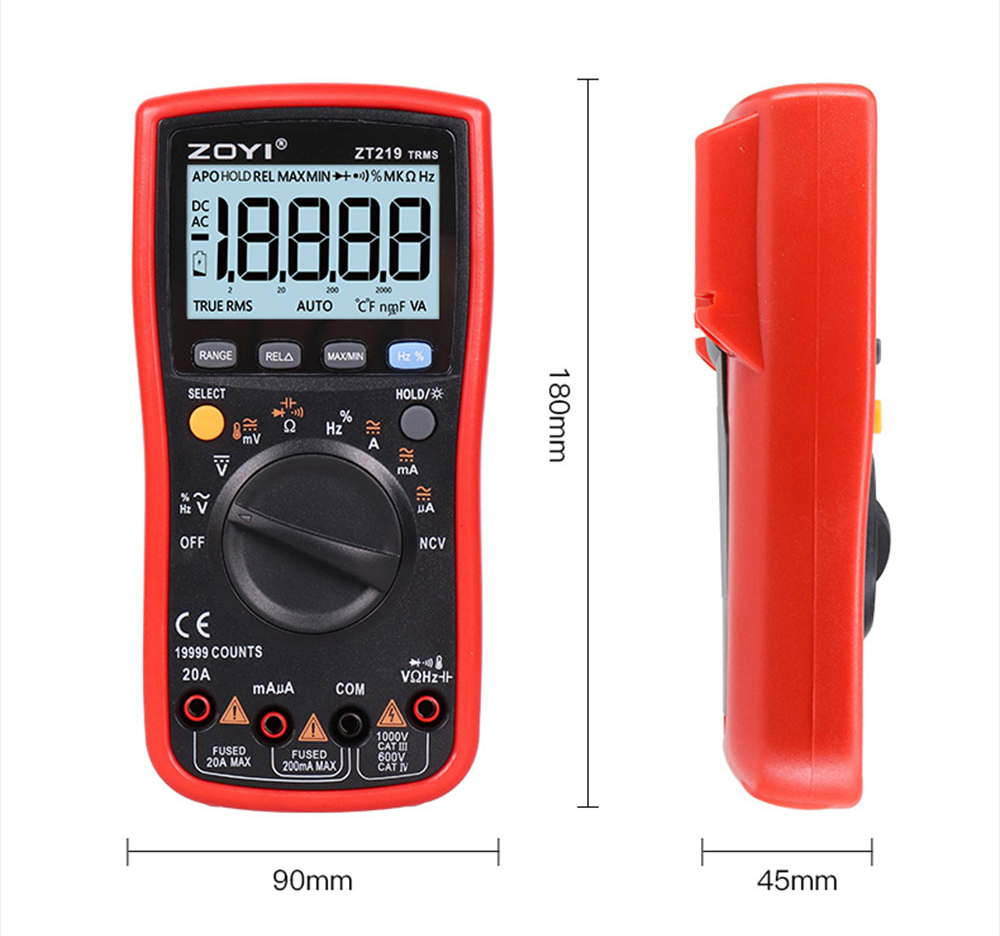 ZOYI ZT219 TRMS Digital Multimeter Tester 19999 Counts Backlight AC/DC Ammeter Voltmeter