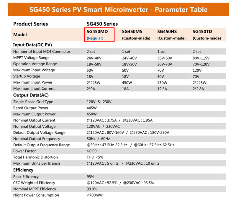 SG450MD(Regular) Solar Power Micro Inverter Max Output Power 450W Input 18V-50V Output 120V+230V