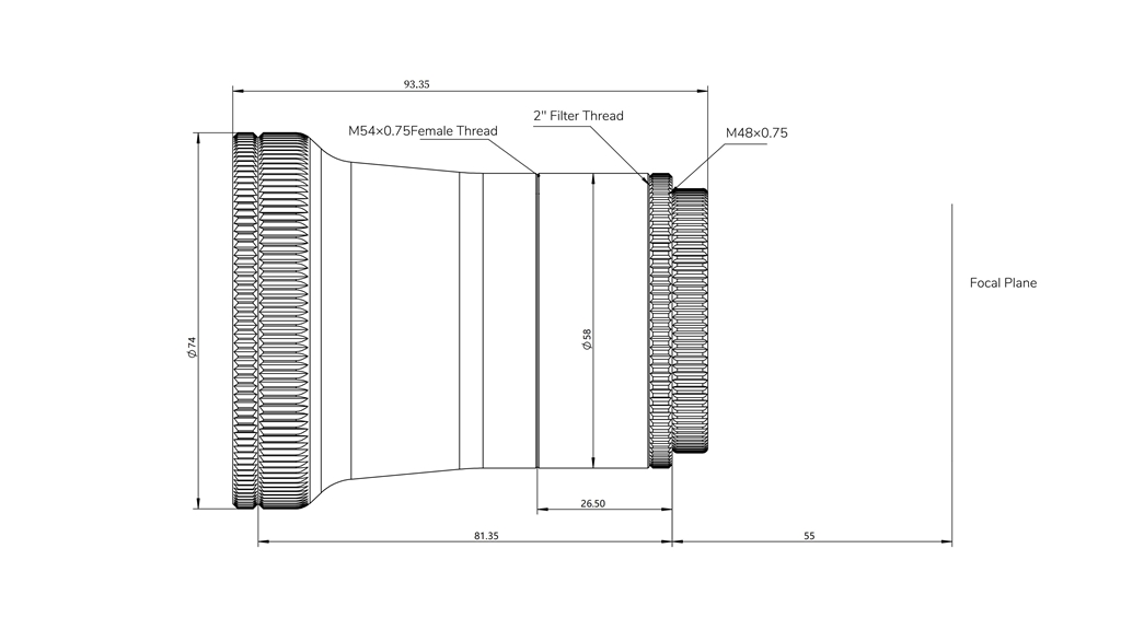 - The flattener: One end of the thread is M68 x 1, connected to the focuser; the other end of the thread is M48 x 0.75 and has a built-in 2" filter thread. The back focus is 55mm. If it needs to be extended, the adapter can be screwed down to reveal the M54 x 0.75 male thread, and the back focus becomes 81.5mm. The flattener adopts a triplet air-spaced structure, the peripheral light reduction control is excellent, can effectively improve the curvature of the field, improve the corner image quality, and reduce aberrations, so that users can take clearer astronomical photos.