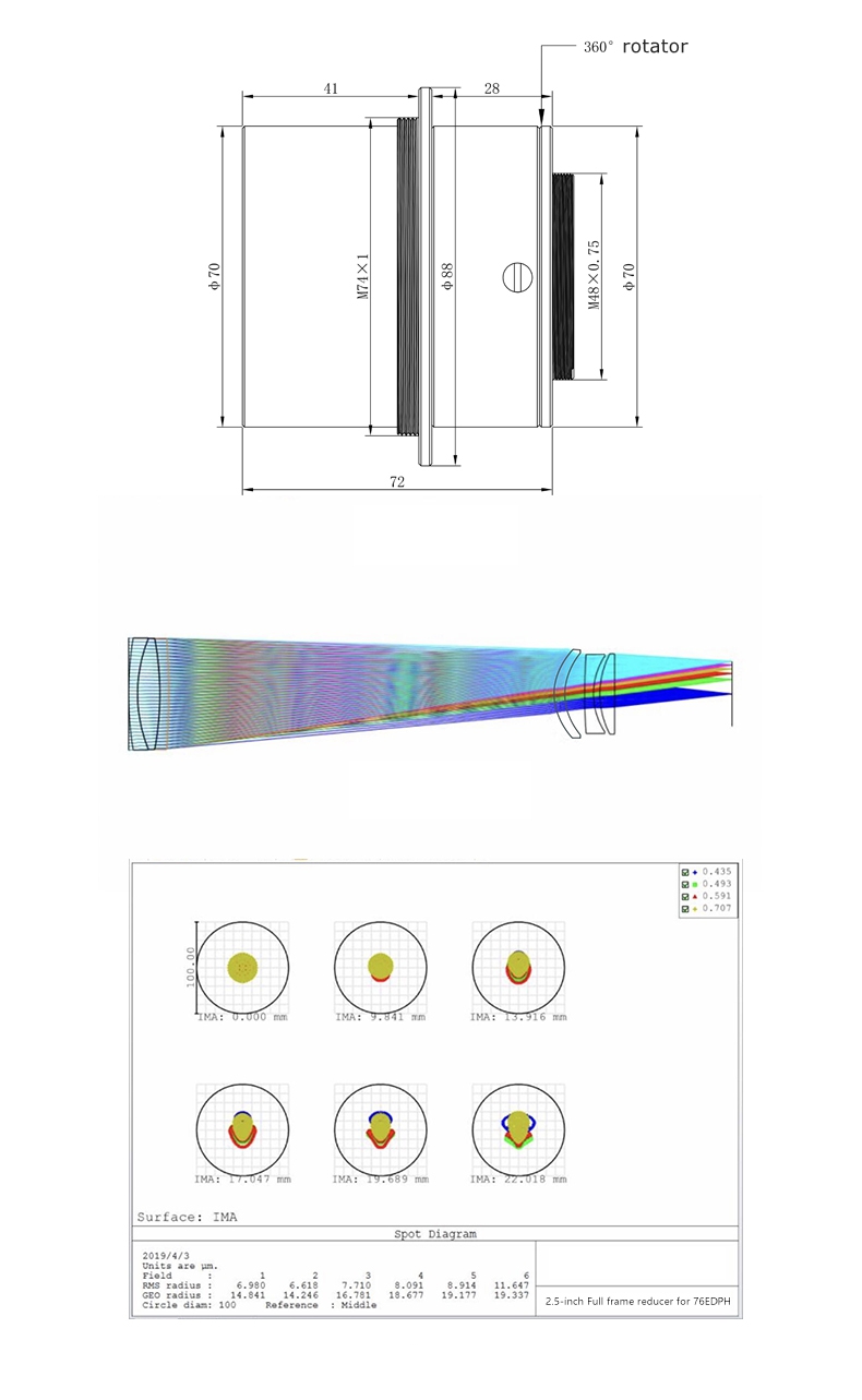 - The 2.5" 76EDPH f/4.5 full-frame reducer is dedicated for 76EDPH astrograph. At one end of the reducer, there is M74x1 thread, tapped for the connection to the 76EDPH’s reducer and at the other end the reducer, there is M48x0.75 thread for the connection of most stock cameras.