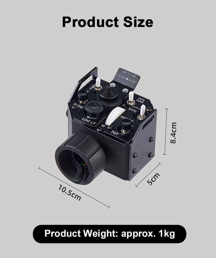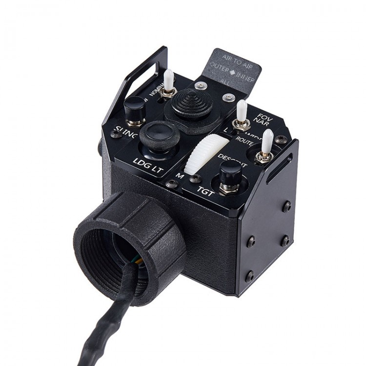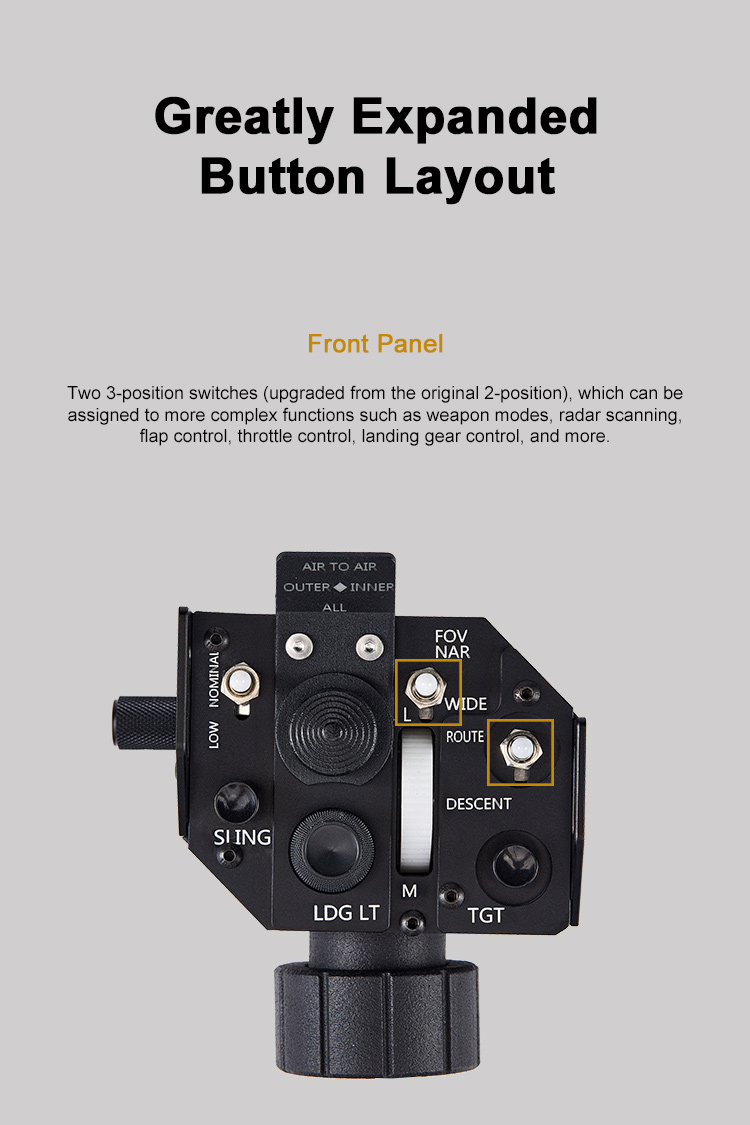 * Front Panel: Two 3-position switches (upgraded from the original 2-position), which can be assigned to more complex functions such as weapon modes, radar scanning, flap control, throttle control, landing gear control, and more.