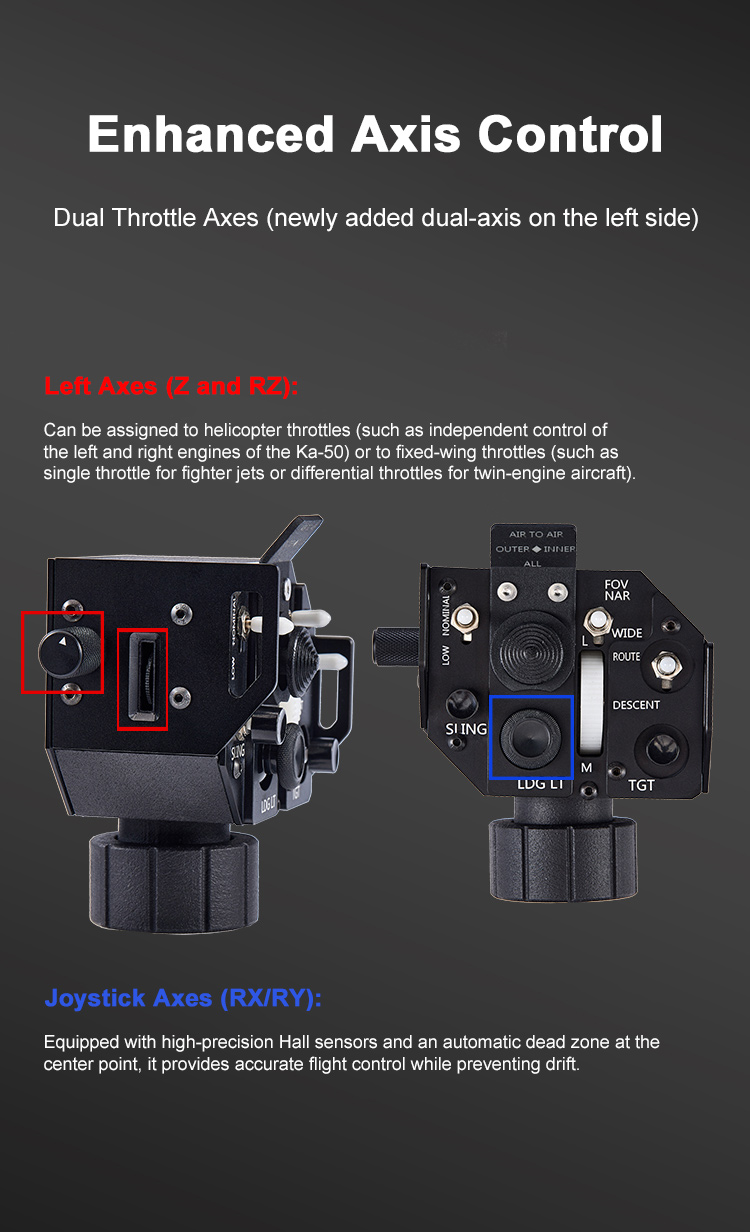 * Left Axes (Z and RZ): Can be assigned to helicopter throttles (such as independent control of the left and right engines of the Ka-50) or to fixed-wing throttles (such as single throttle for fighter jets or differential throttles for twin-engine aircraft).