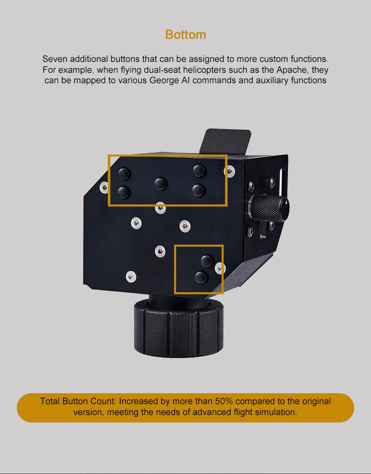 * Bottom: Seven additional buttons that can be assigned to more custom functions. For example, when flying dual-seat helicopters such as the Apache, they can be mapped to various George AI commands and auxiliary functions.