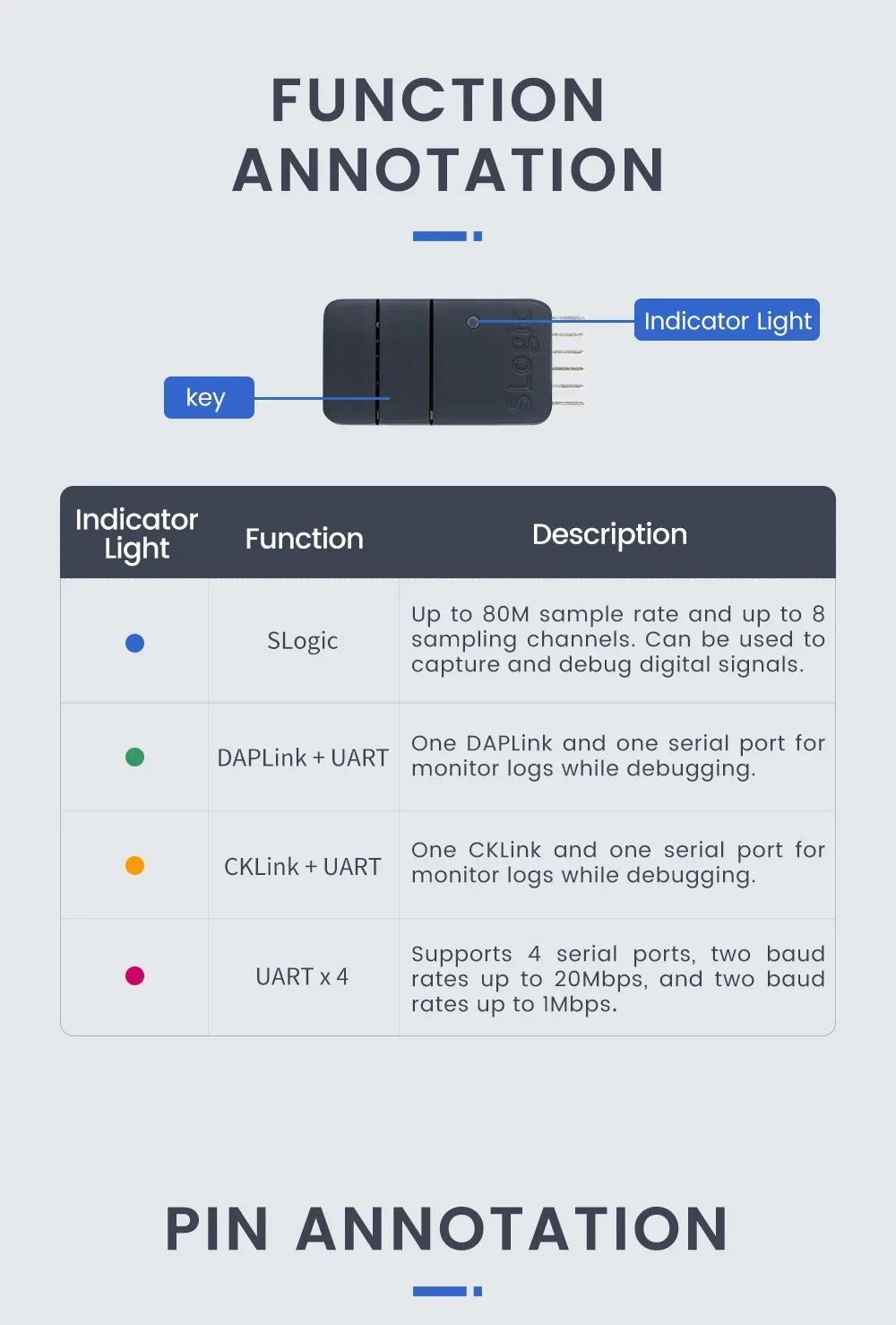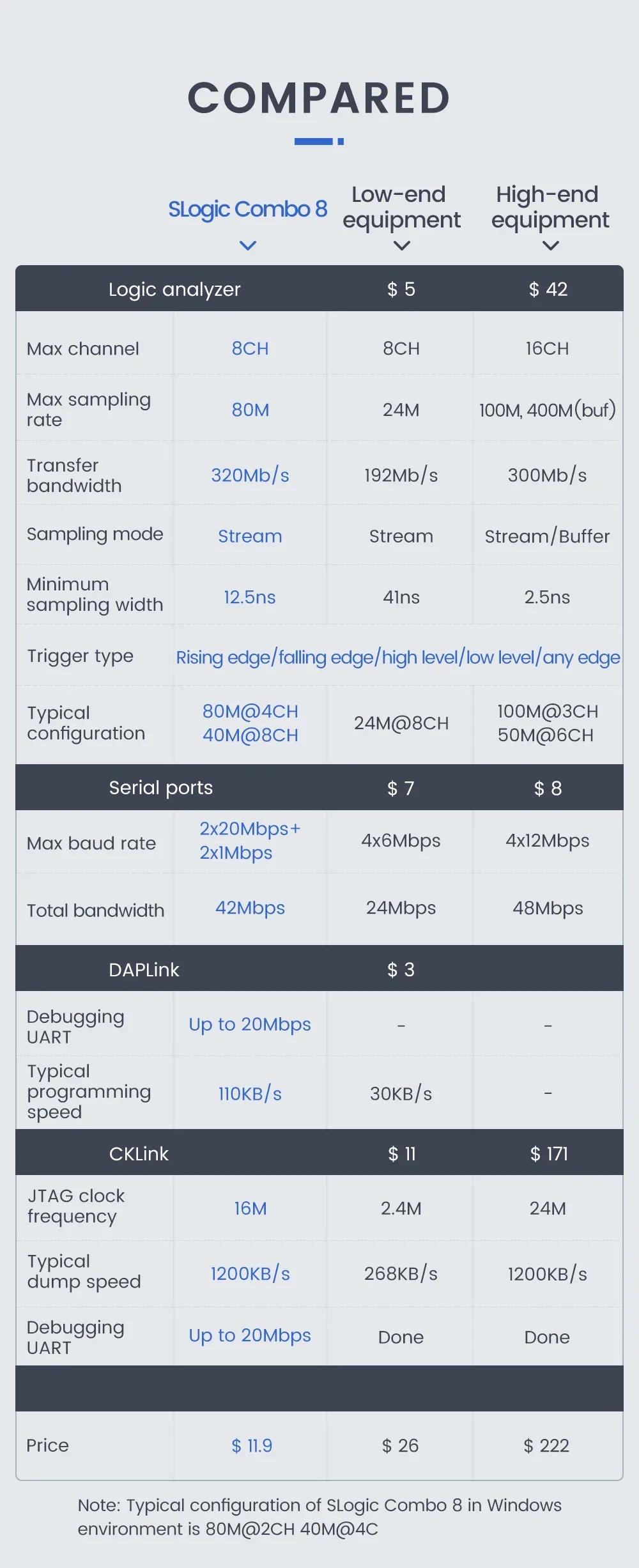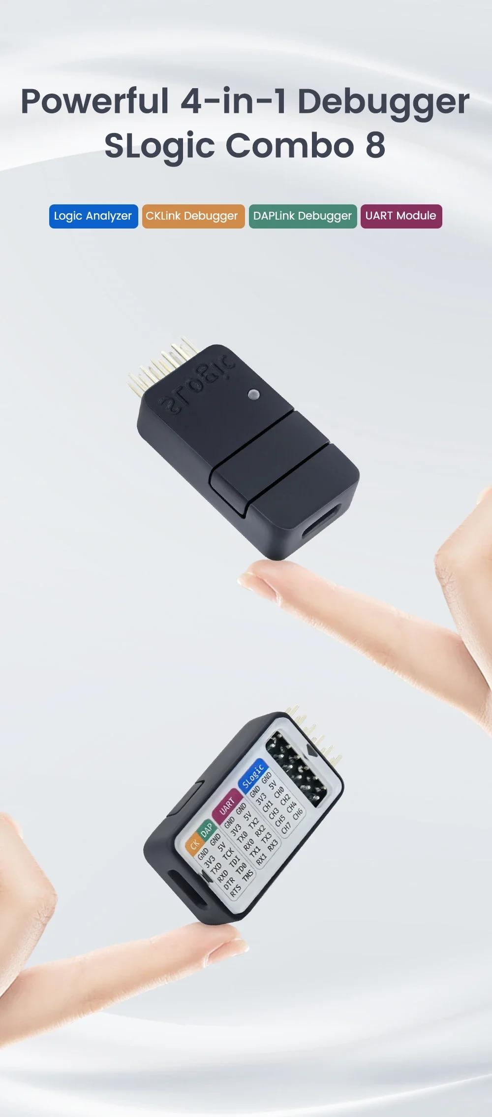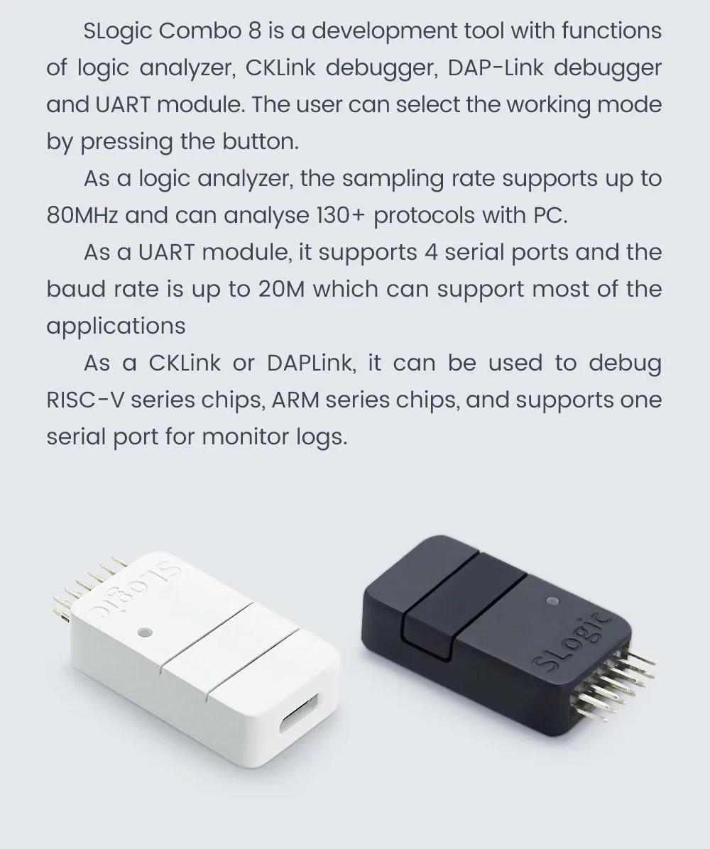 - SLogic Combo 8 is a development tool with functions of logic analyzer, CKLink debugger, DAP-Link debugger and UART module. The user can select the working mode by pressing the button.