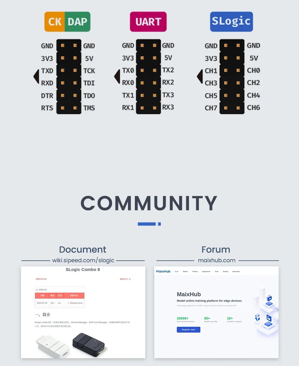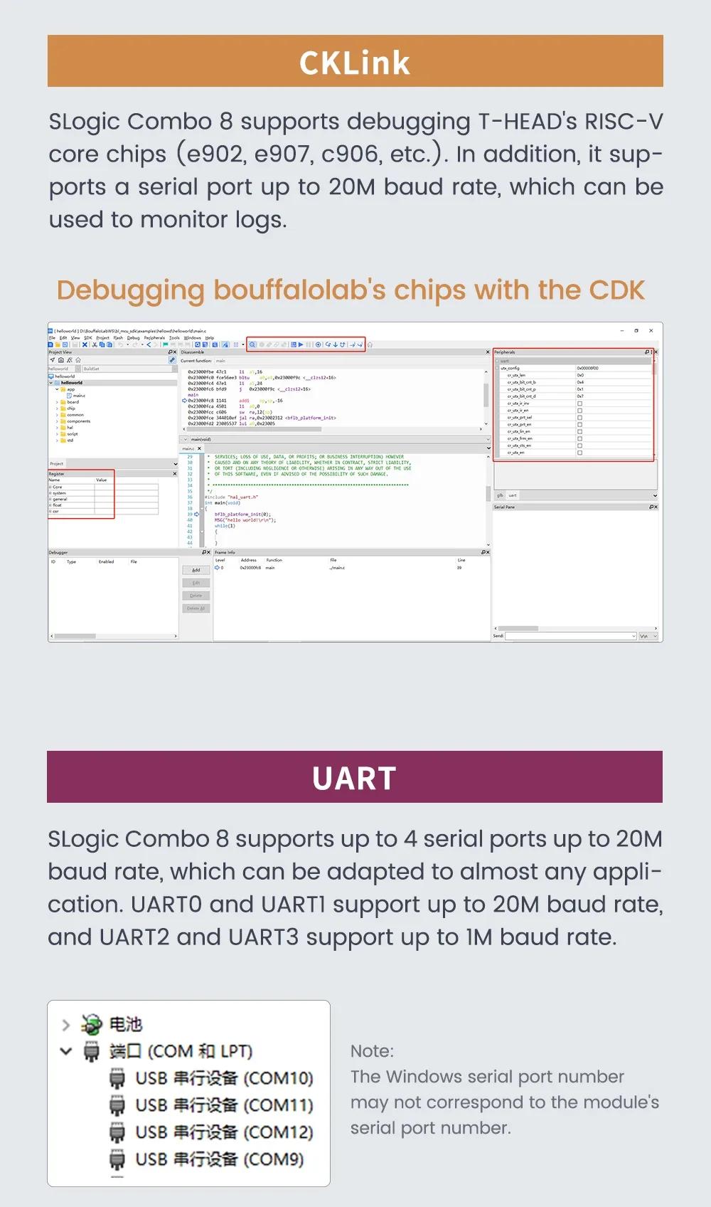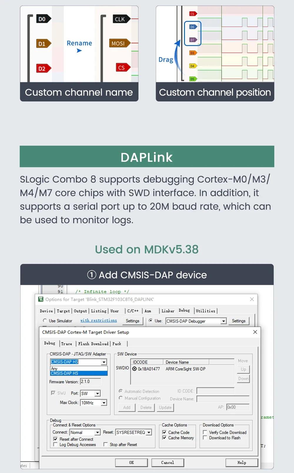 - SLogic Combo 8 is a development tool with functions of logic analyzer, CKLink debugger, DAP-Link debugger and UART module. The user can select the working mode by pressing the button.