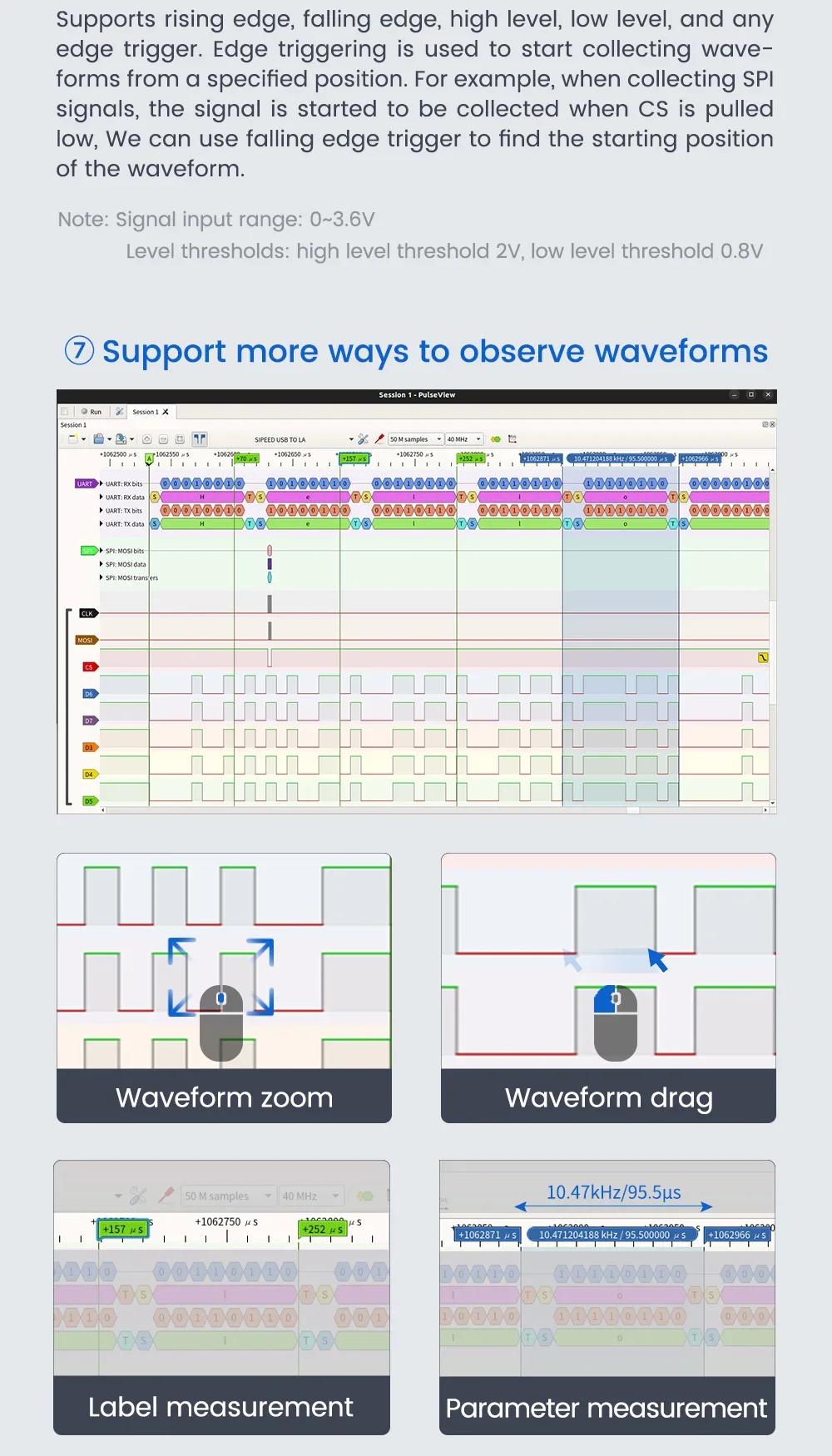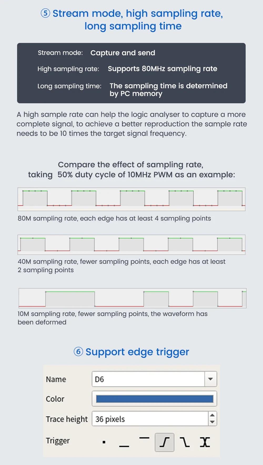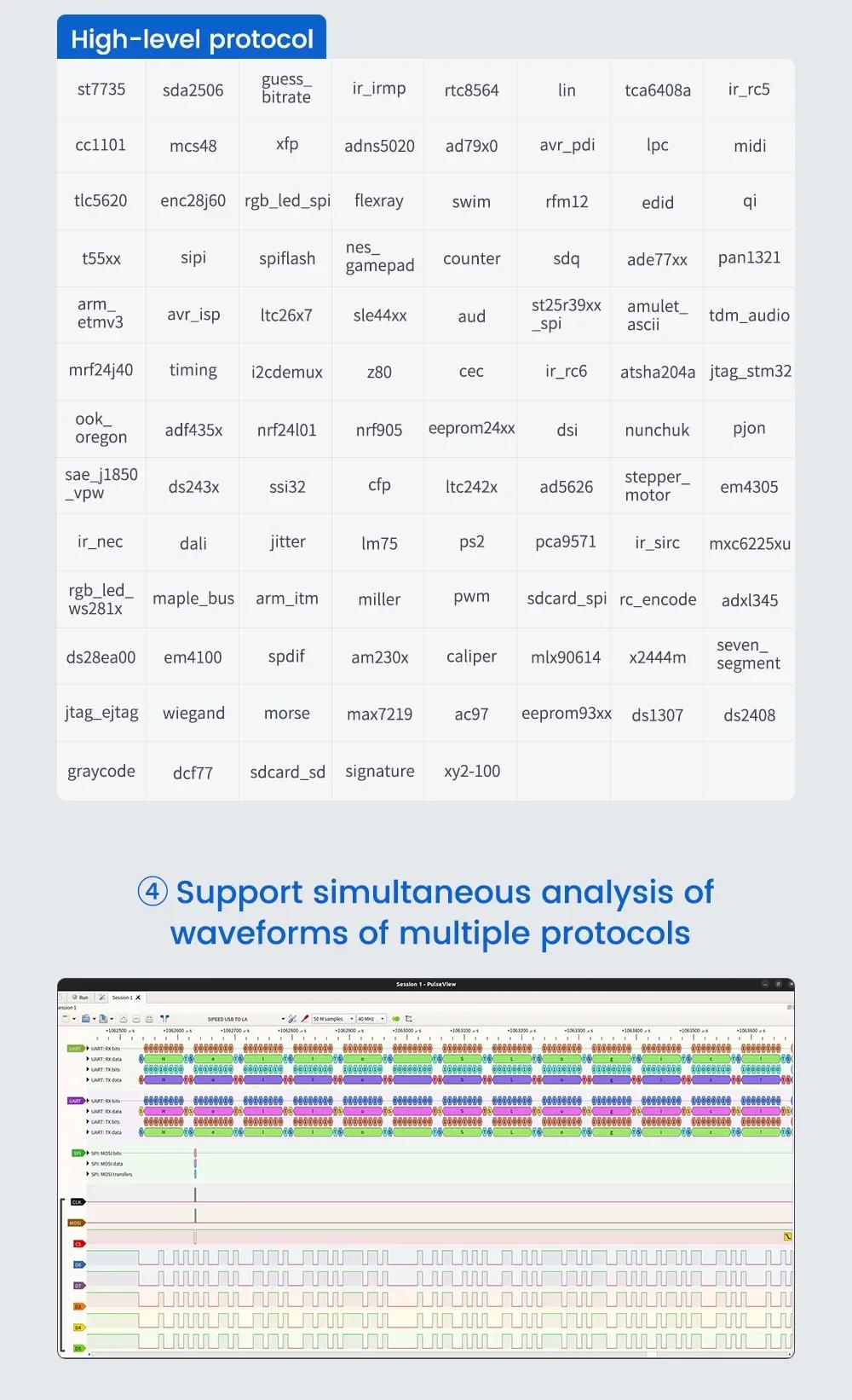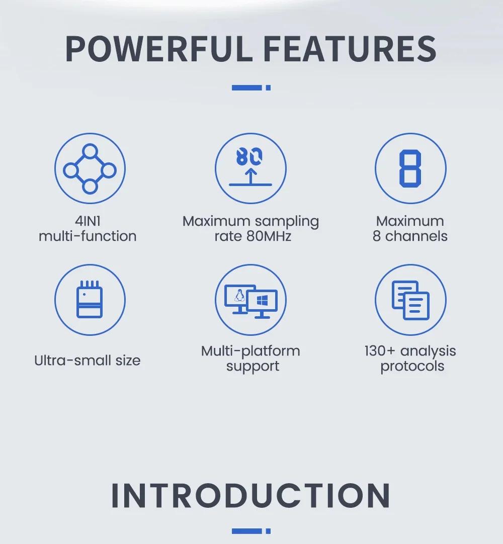 - As a logic analyzer, the sampling rate supports up to 80MHz and can analyse 130+ protocols with PC.