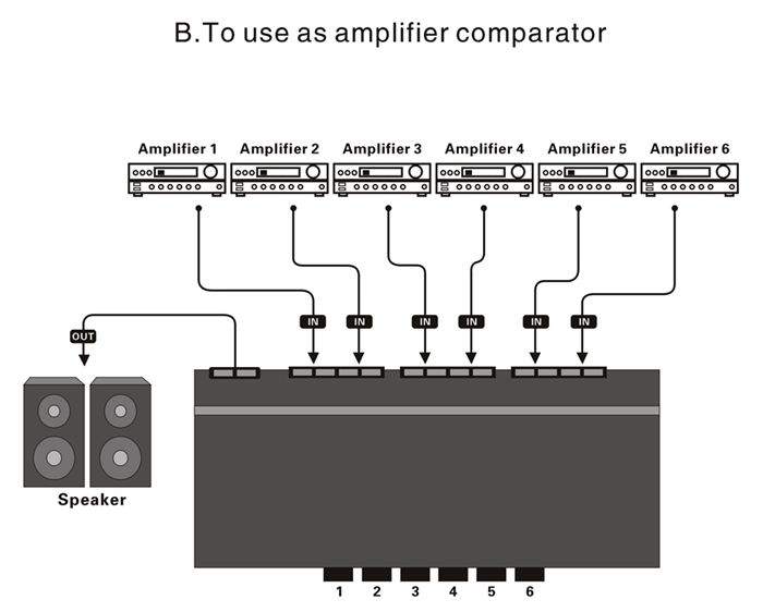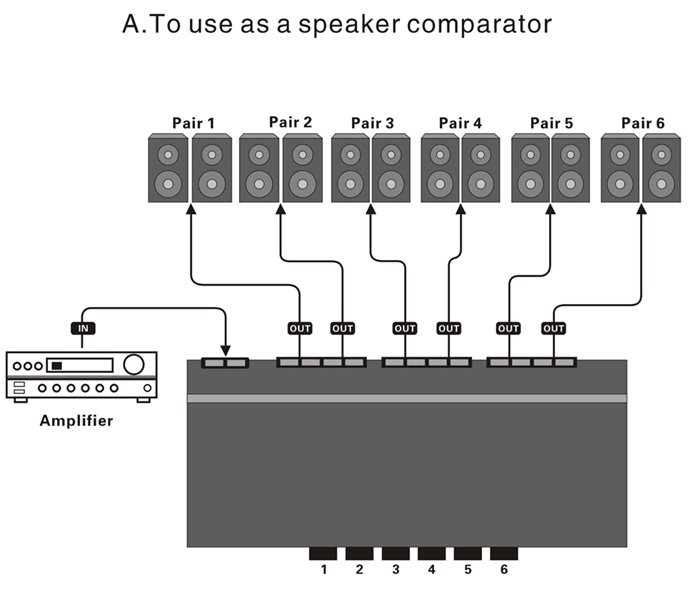 This speaker selection can also be used in the opposite way, imagine having multiple amplifiers connected to a speaker pair for setting. Because each stereo amplifier has its own sound characteristics, the user can connect different power amplifiers to the switch and then output to the same speaker pair.