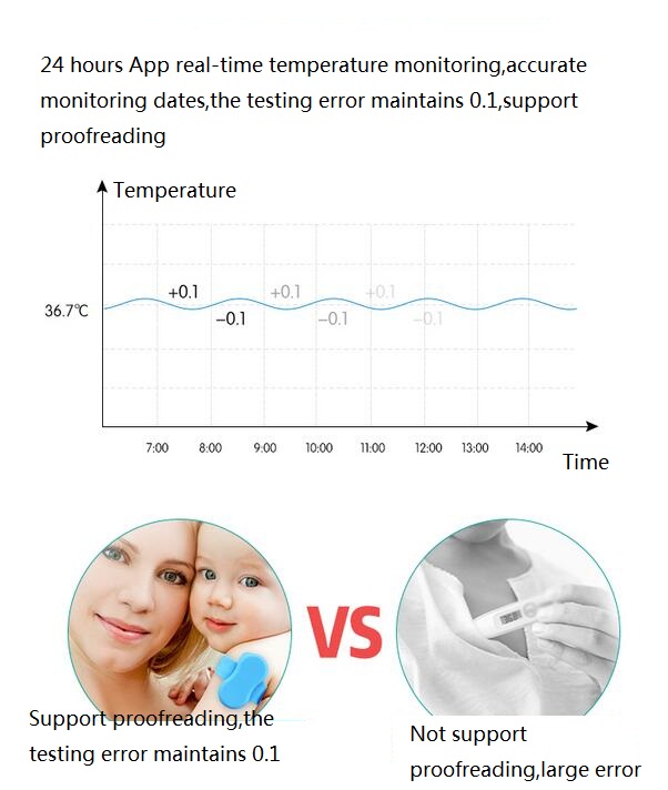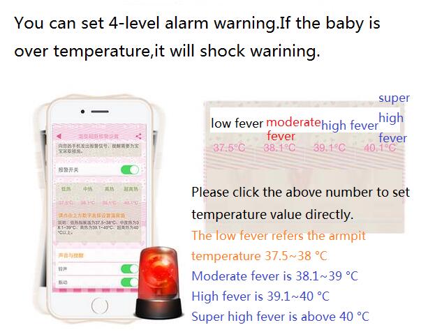 - 24 hours real-time monitoring,It the baby gets a fever,it will alarm.you can know the baby fever condition,help the baby treatment.