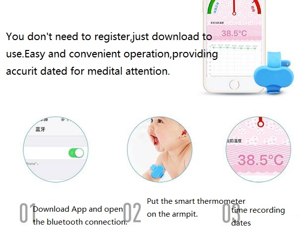 - Procedure:Download App and open the bluetooth connection.Put the smart thermometer on the armpit.Chick the App real-time recording dates.