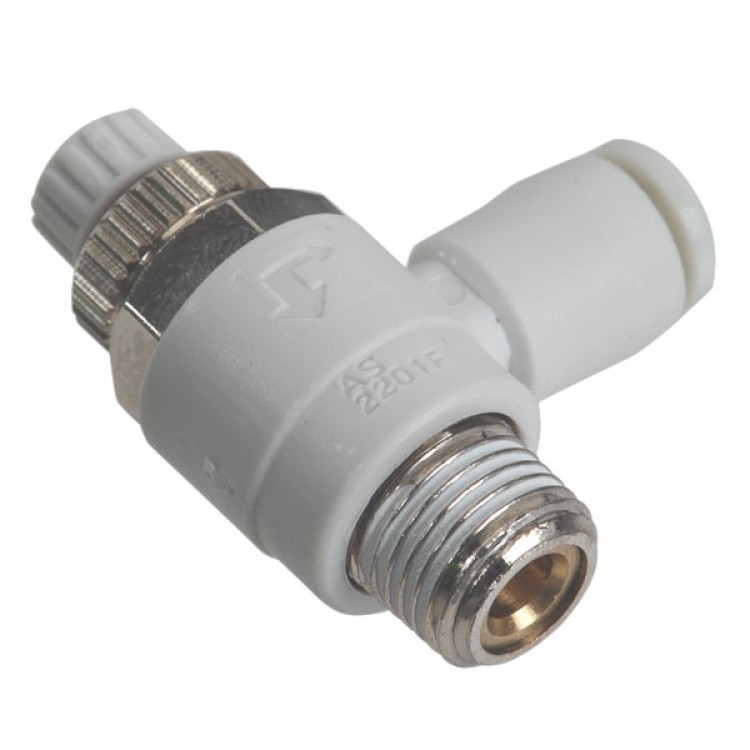 - The SMC AS elbow air flow control valve is made of polybutylene terephthalate (PBT) plastic and nickel-plated brass with male metric threads on the inlet port and a metric push-to-connect tube fitting on the outlet port. The valve body is made of PBT for strength and light weight, and the internal metal parts are made of nickel-plated brass for resistance to corrosion. This valve is designed to be located downstream of the cylinder for meter-out control, and the knob provides eight needle rotations (ten for the 2 mm outlet size) for precise manual adjustment of the air flow. The push-to-connect outlet fitting allows a one-touch connection to nylon, soft nylon, or polyurethane tubing. The maximum operating pressure is 145 pounds per square inch (psi) for outlet sizes from 3.2 to 6 mm, and 101.5 psi for outlet size 2 mm. The ambient and fluid temperature range is 23 to 140 degrees F (-5 to 60 degrees C). This air flow control valve has a hexagonal lock nut to lock the needle setting, and a retainer to help prevent accidental loss of the needle.