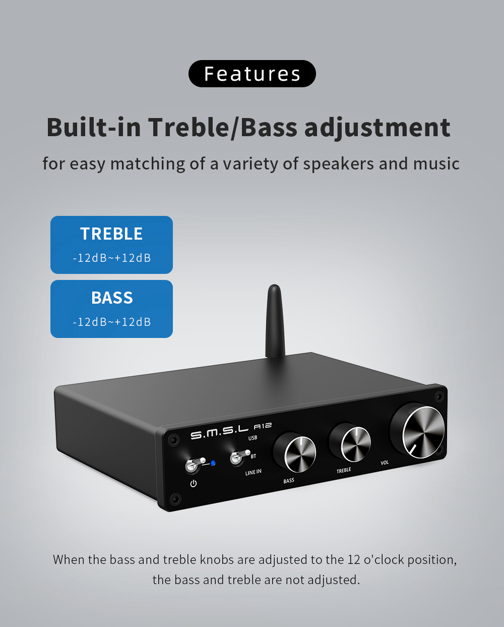 - Built-in treble / bass adjustment for easy matching of a variety of speakers and music