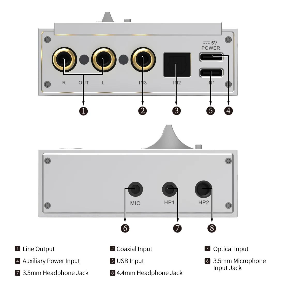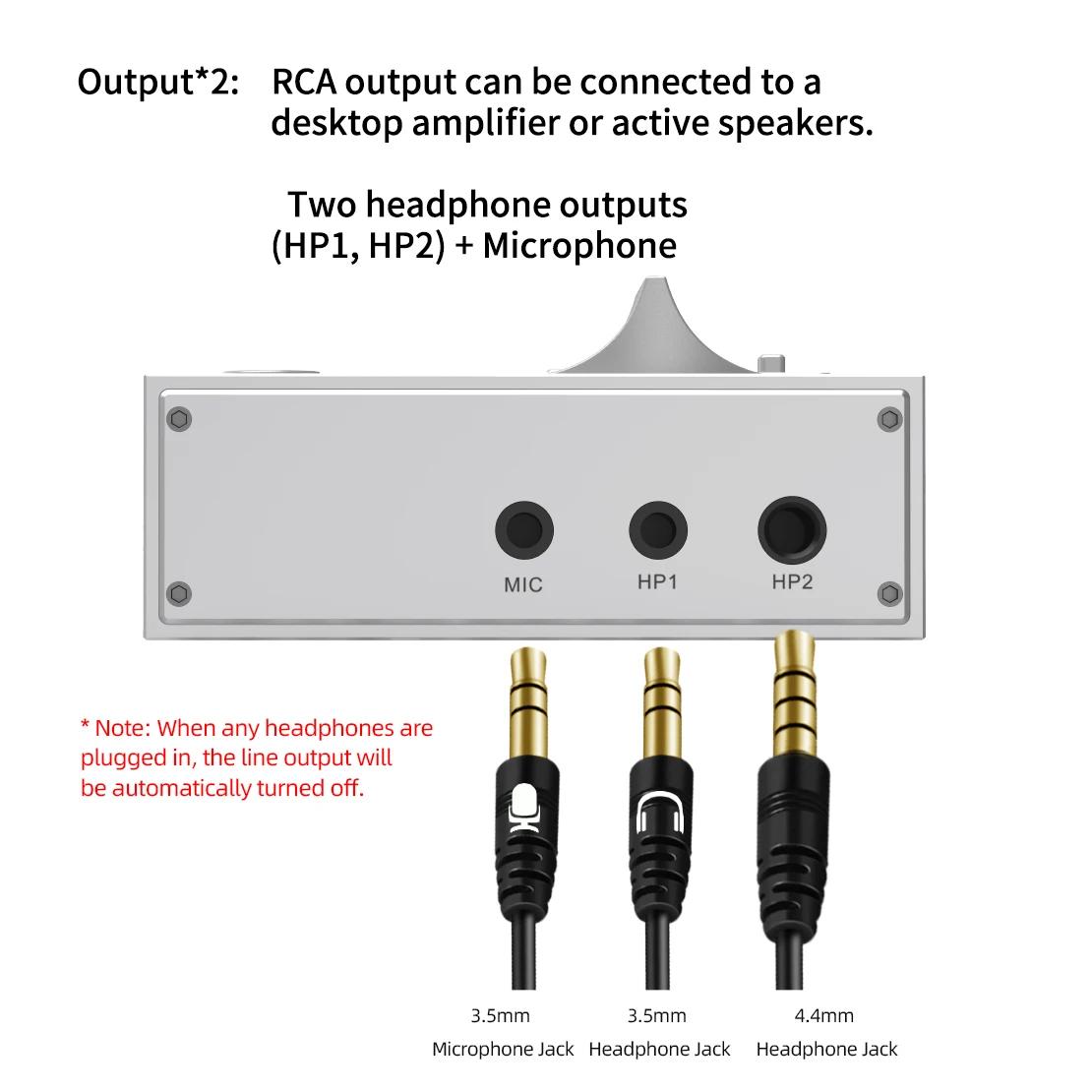 Outputs: RCA (for desktop amplifiers/speakers), two headphone outs (compatible with 3.5mm/6.35mm connectors).