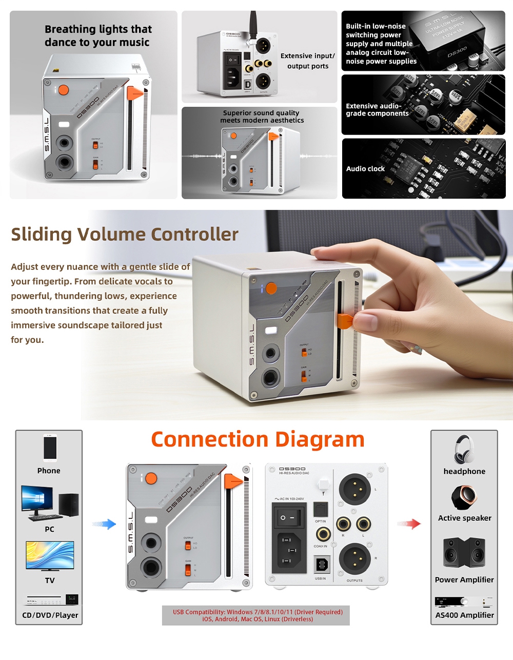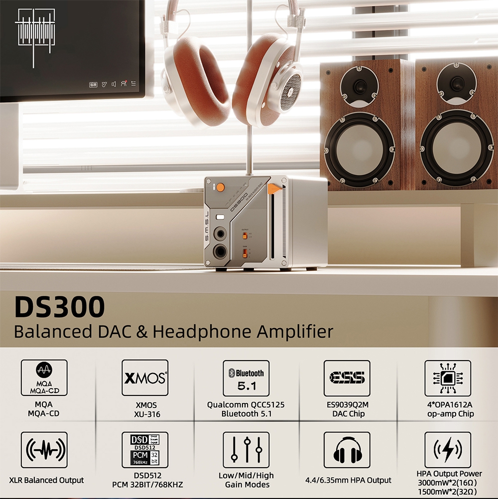 SMSL DS300 Bluetooth5.1 Audio Decoder ES9039Q2M DAC 4.4/6.35mm Output Headphone Amplifier Support for MQA CD