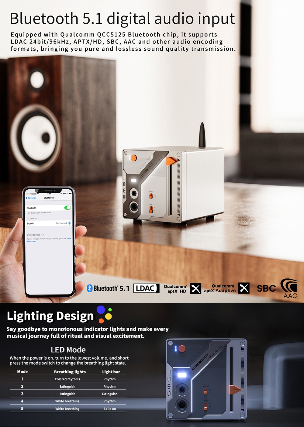 - Bluetooth chip supporting for LDAC 24bit/96kHz, aptX HD, SBC, and AAC.