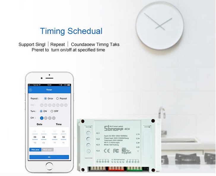 - Sonoff 4CH belongs to Sonoff family,definitely,it bears all the functions basic Sonoff has.In EweLink,you can remote turn on/off from anywhere at any time,set single/repeat/countdown timing schedules to turn on/off at a specified time,share to others so that they can control together.