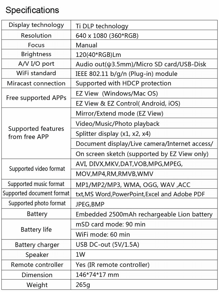 SP-1200W DLP WiFi Mini Projector Video Player&Power Bank for Smart Phone Tablet Laptop