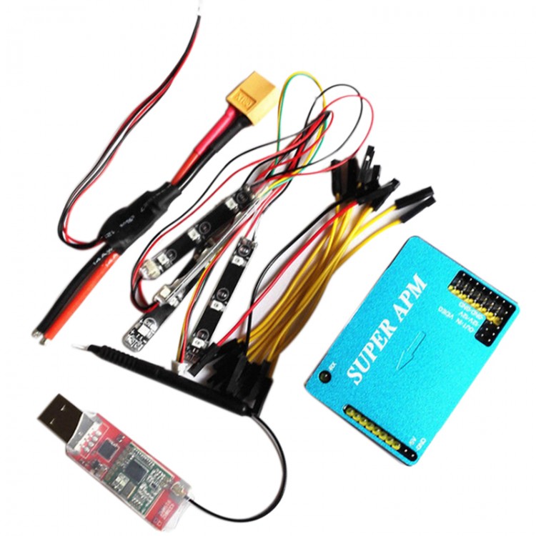SUPER APM is mainly integrated with MINI OSD, 3DR transmitter, current voltage sensor, unlocked light and GPS light. There are four light bars, two red and two blue, 3 lemp beads for each one.