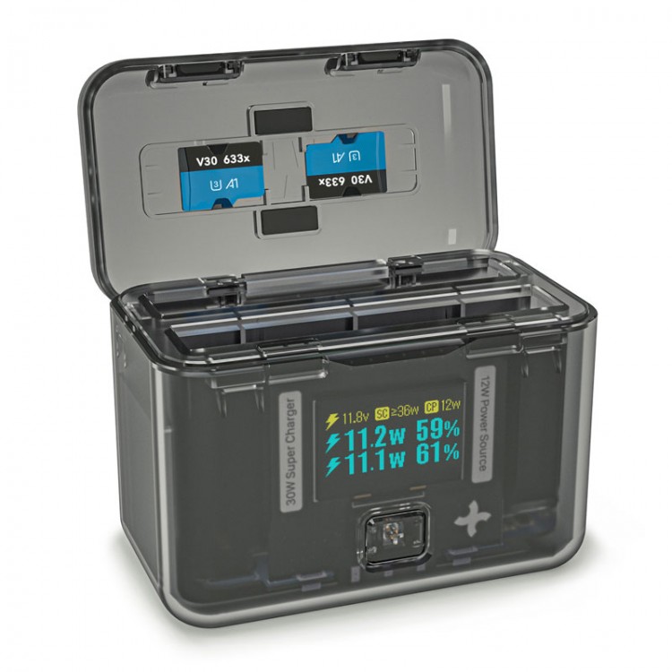 - Intelligent 3-in-1 charging case, dual-channel fast charging hub, mobile power converter and battery organizer in 3-in-1.