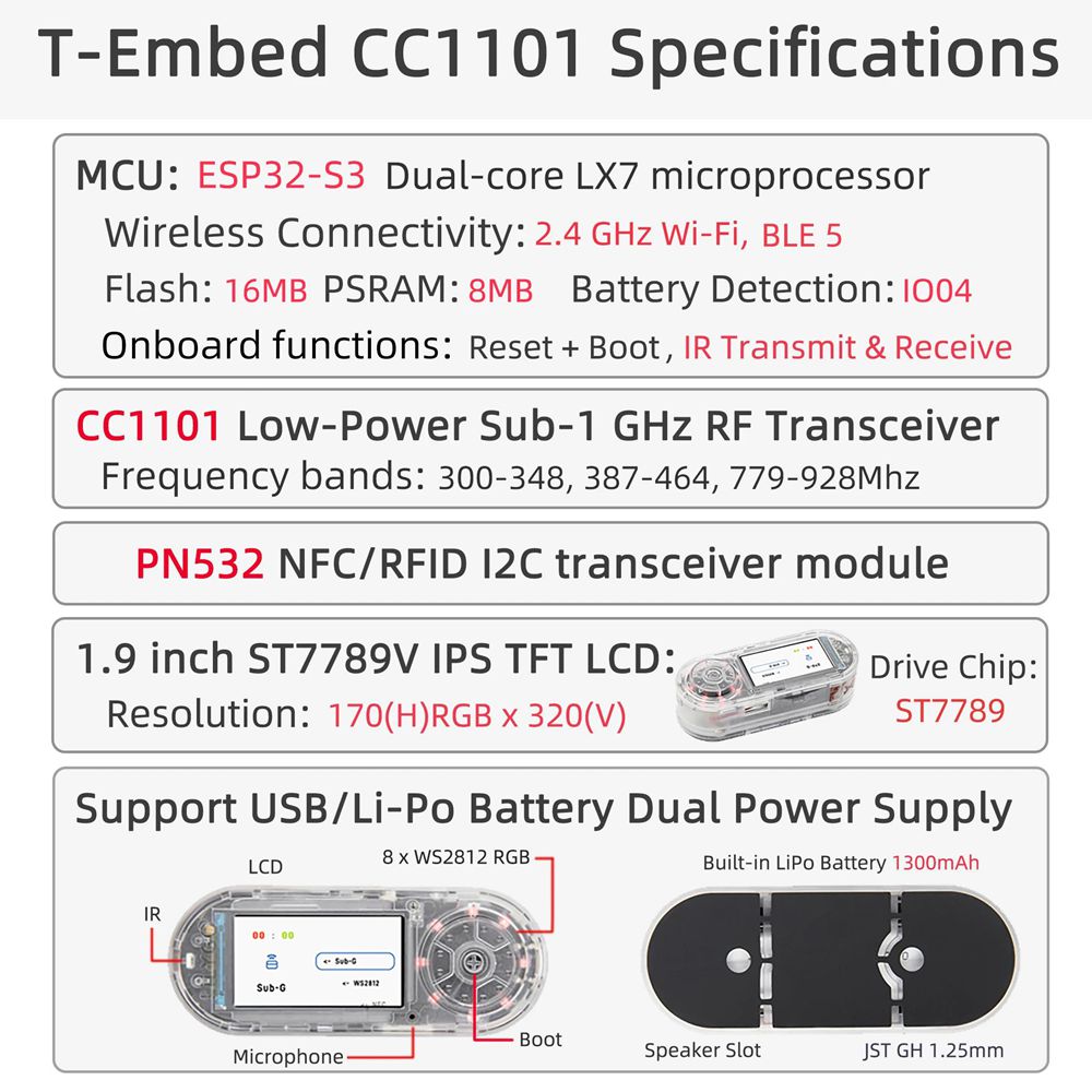 T-Embed-CC1101 ESP32-S3 MCU 2.4GHz WiFi PN532 RF Transceiver Module 1.9-inch LCD Development Board with Black Shell