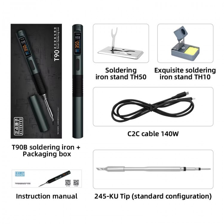 T90B (T245 Tip) Portable Intelligent Soldering Iron IPS LCD Screen 18-140W Constant Temperature Soldering Pen with TH10 Stand