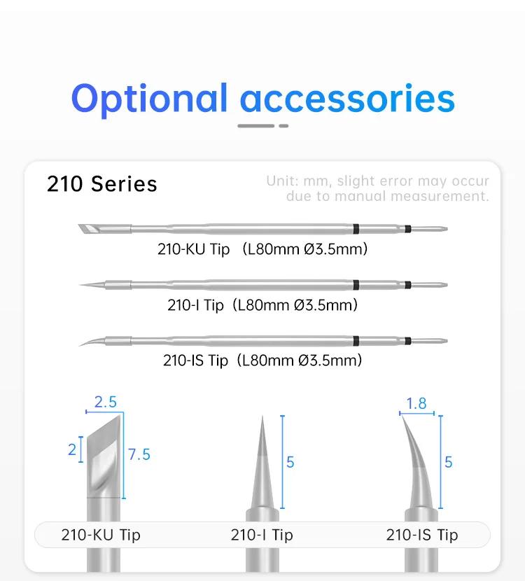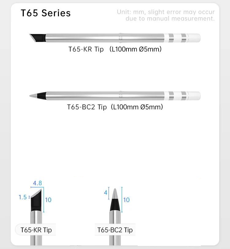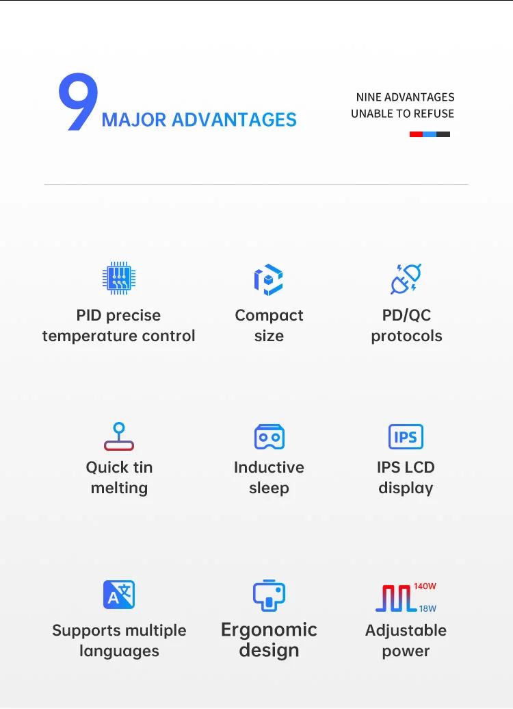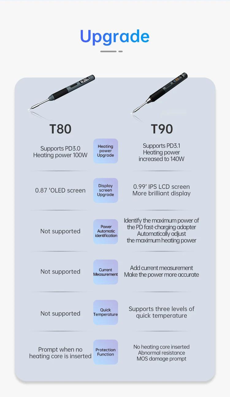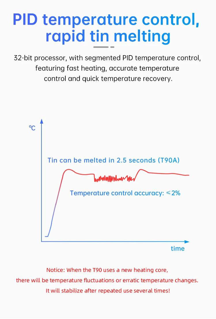 - Fast heating, 2.5 seconds to melt tin (T90A at 65W).