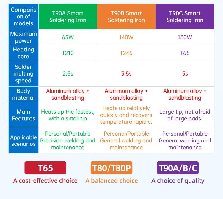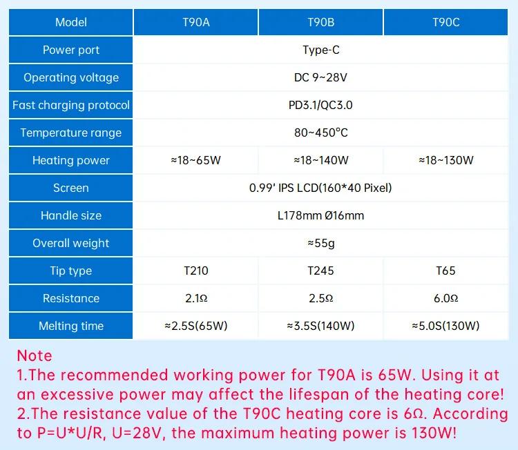 - Corresponding heating cores: T90A (T210), T90B (T245), T90C (T65).