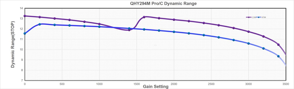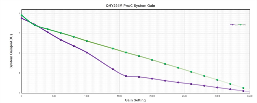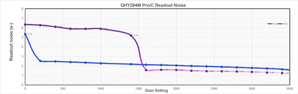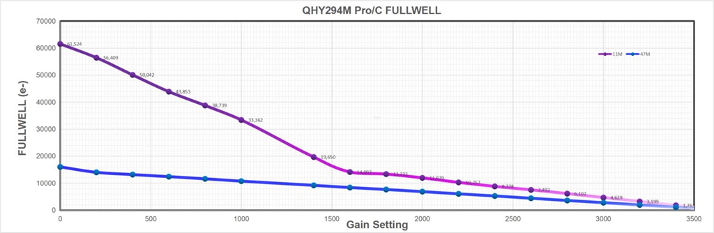 - The QHY294 Pro CMOS sensor has a dual gain mode, HGC (high gain) and LGC (Low gain). The QHY294 Pro will switch the two modes automatically when the gain is set to 1600 you will get the benefits of the ultra low read noise (1e- to 1.6e-) of the HGC mode and a full well capacity of about 14.5ke- at the switch point setting.