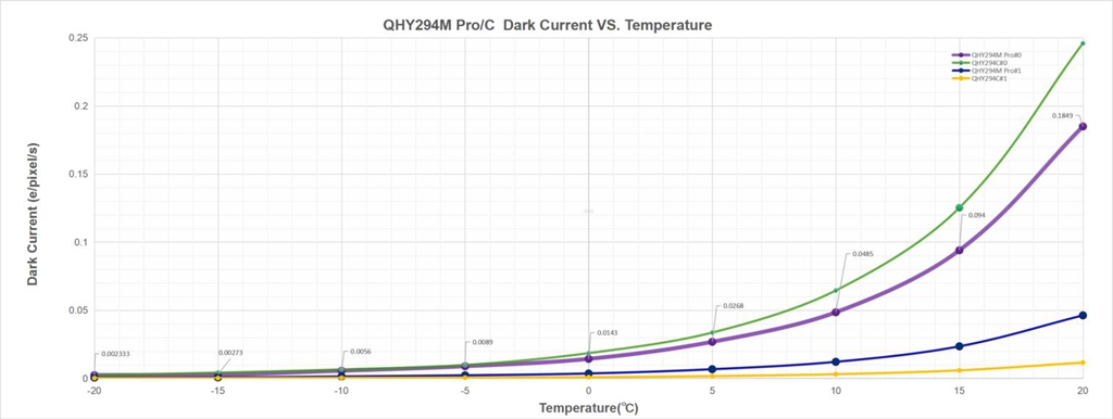- Dark current: 0.002e-/pixel/sec at -20℃; 0.005e-/pixel/sec at -10℃