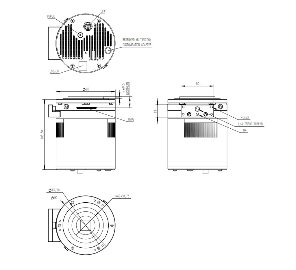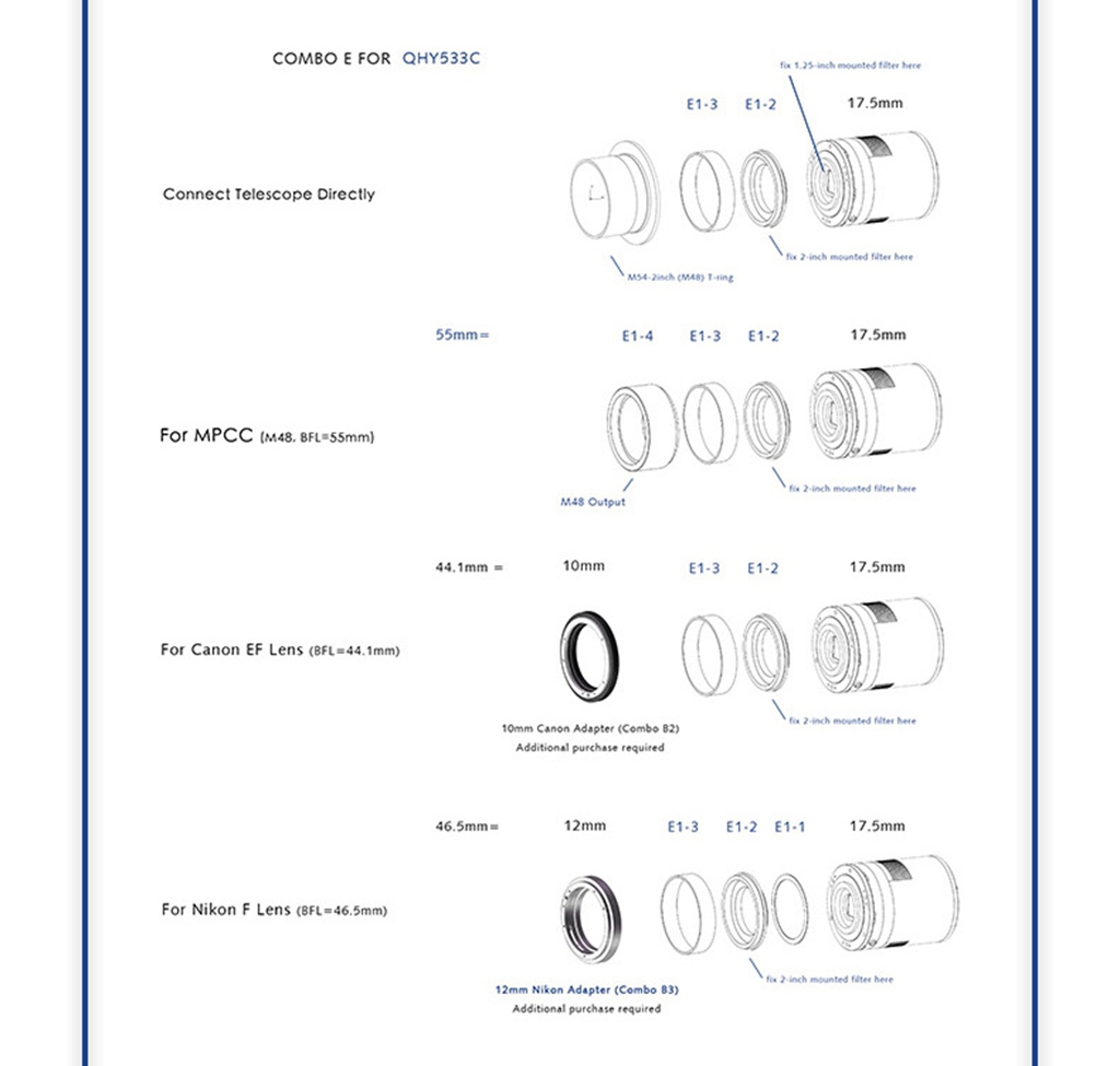 - QHY533C comes with a standard adapter set E, which can be used to directly connect a correction mirror with a 55mm intercept M48 thread. Alternatively, Nikon/Canon DSLR lenses can be directly connected through this adapter set (simply purchase an additional DSLR lens adapter). At the same time, the QHY533C front-end also provides a 1.25-inch thread, and users can install a 1.25-inch filter according to their own needs.