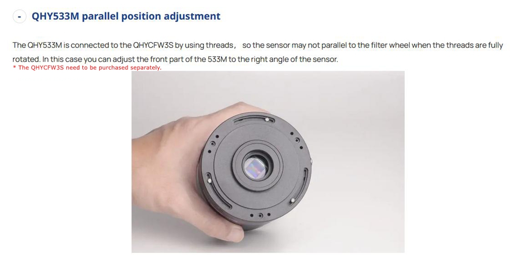 - The threaded interface used on the exterior of QHY533M can be directly connected to a small filter wheel. This time, we are launching a special standard small filter wheel version together with QHY533M. Users can directly assemble it externally without removing the disc. When the QHY533M+filter wheel combination is connected to a DSLR lens, only an additional DSLR lens adapter ring (not included) is needed to complete focusing. QHY533M provides C-port thread, which can directly install C-port lens.