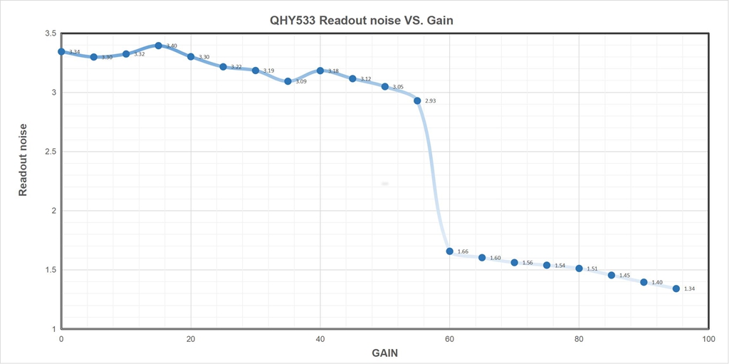 - Readout noise: 1.3 to 3.4e-
