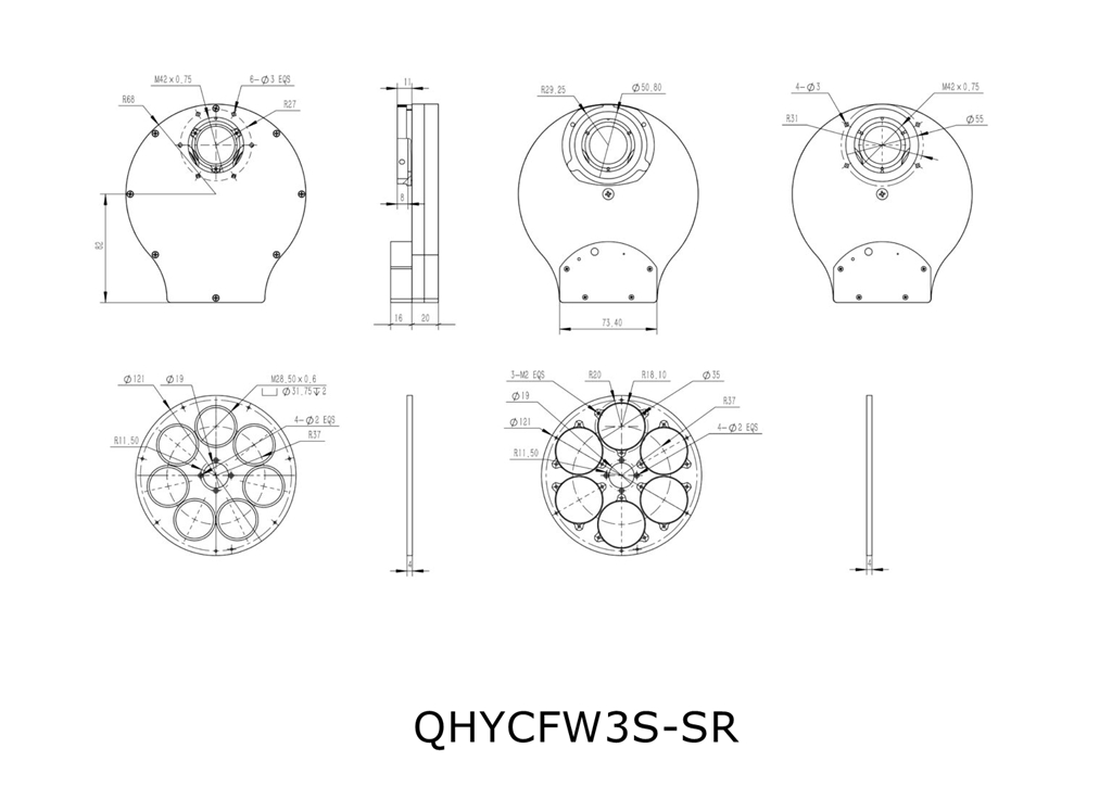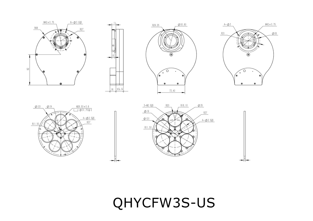 - Back focus consumed: 20mm + 4mm for QHYCFW3S-SR/15.5mm+4mm for QHYCFW3S-US