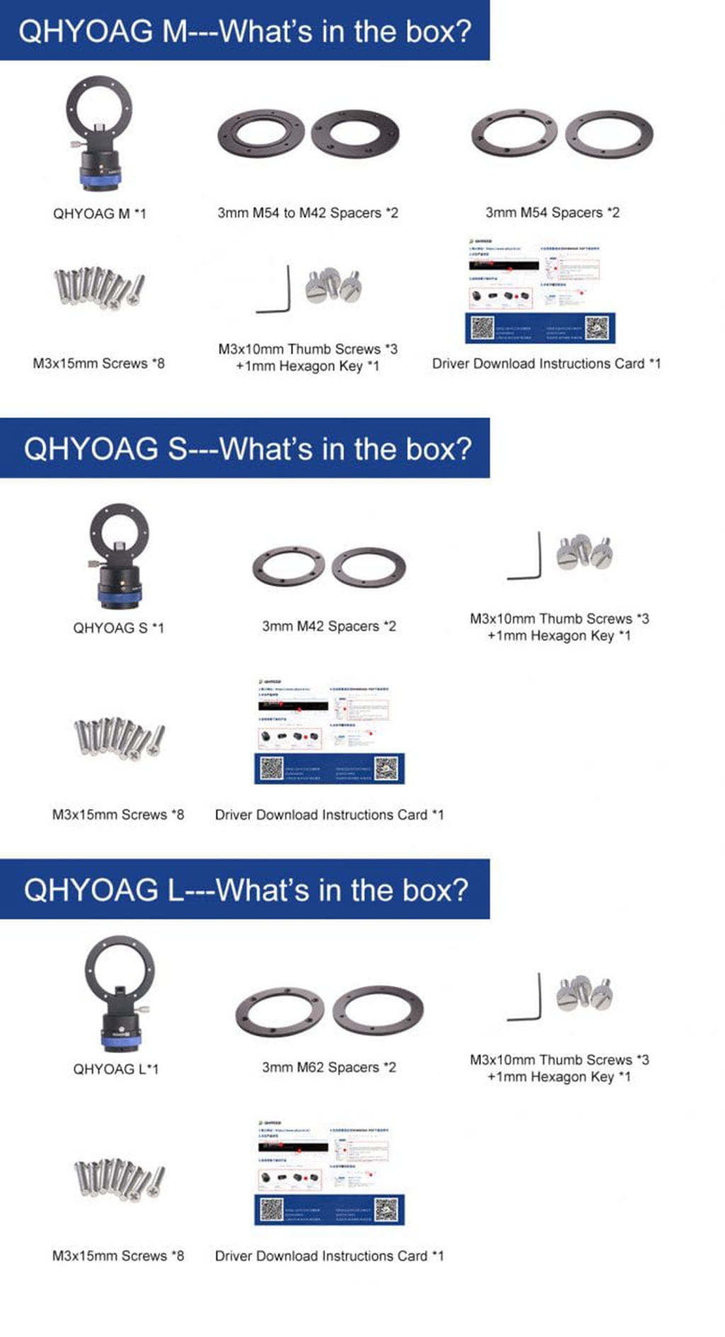 - QHYOAG is a thin and solid design. The OAG main body is just 10mm thick. Adding an M42 thread or M54 adapter ring adds only 3mm for a total thickness of 13mm. There are six 3mm through holes in the OAG for direct connection to the QHYCFW and QHY A Series cameras.