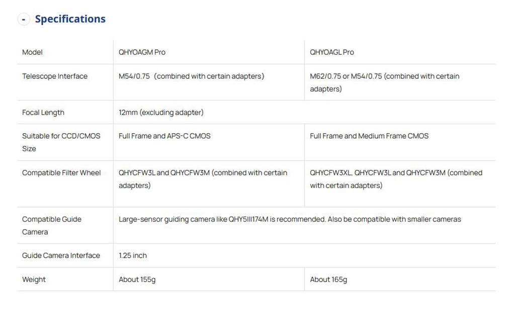 The QHYOAGL Pro is designed to support cameras with larger sensors like the QHY461PH, QHY600, and their corresponding large optical systems. Therefore, it only provides M62 and M54 thread outputs.