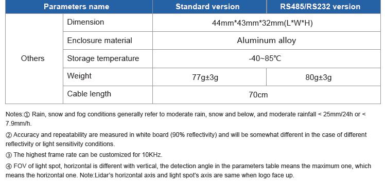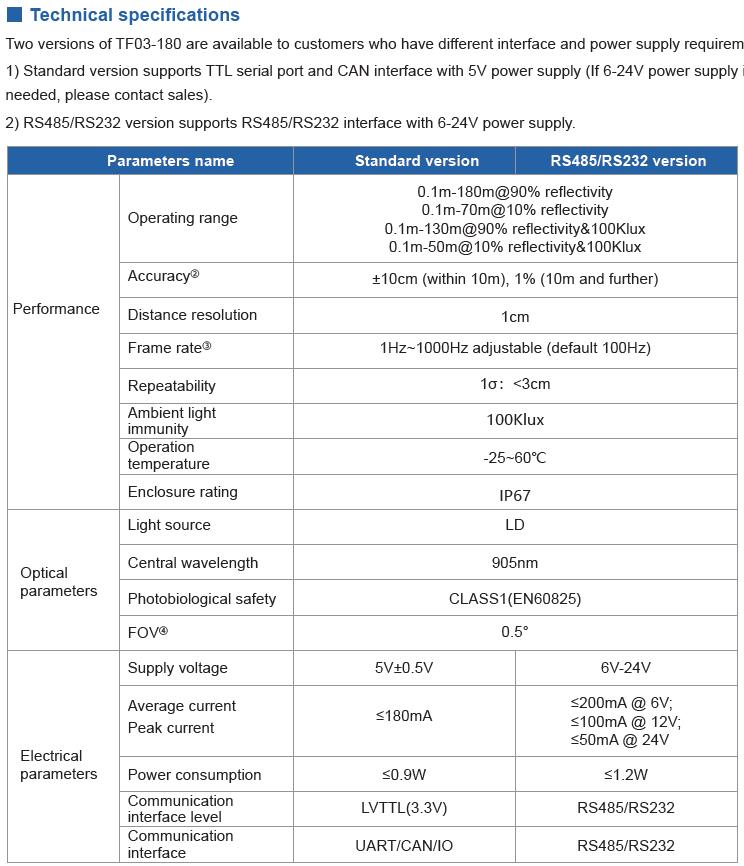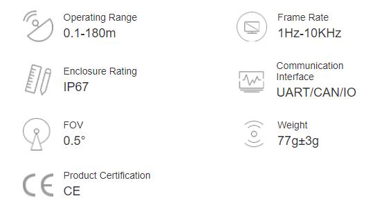 -TF03-180 is a industrial high-speed lidar with a range of up to 180m. TF03-180 includes compensation algorithms for outdoor glare and other interference, so it works normally under strong light environment and rain, fog and snow conditions. Different built-in operating modes let customers change parameters and configuration to meet their need.