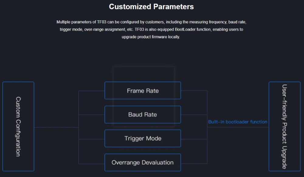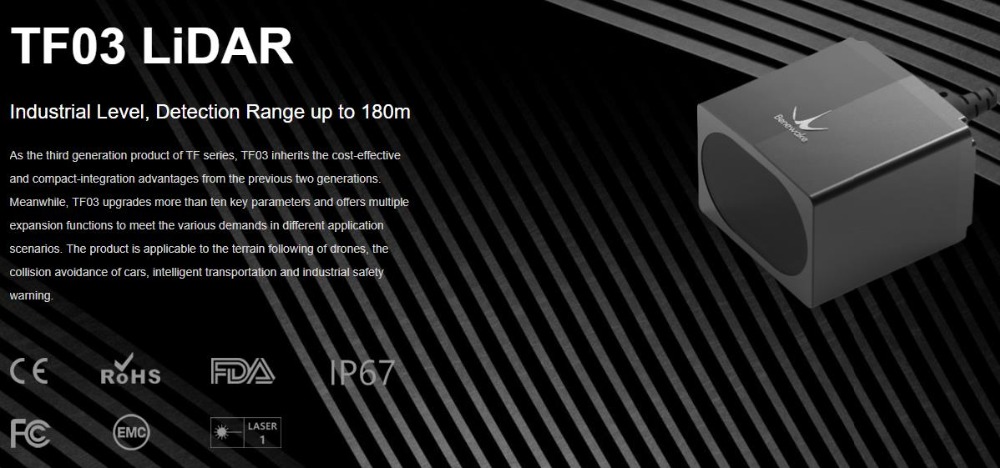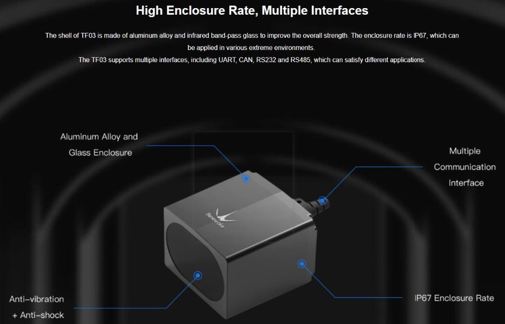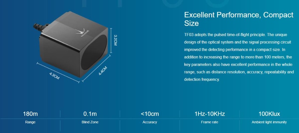 -As the third generation product of TF series, TF03 inherits the cost-effective and compact-integration advantages from the previous two generations. Meanwhile, TF03 upgrades more than ten key parameters and offers multiple expansion functions to meet the various demands in different application scenarios.