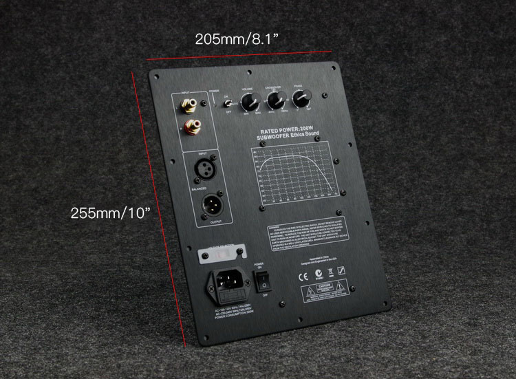 With rated power 200W output. It adopts high-efficiency half-bridge power supply, with 120V and 230V transfer switches for global use. And its power supply margin is quite large, and ripple is lower than that of traditional transformer power supply. The power amplifier output also uses MOS high-current tubes output, which achieves 1% distortion of 200W, and the control is amazing. The front stage adopts the current high-tech in the subwoofer industry, using dynamic EQ algorithm, high speed, low diving, and high control. A low-cut is also designed, which cuts all the frequency below 18Hz, and converts the energy to the frequency range of 25Hz-60Hz, which makes people sound endless and full of energy. In addition, the board uses an aluminum back panel, there being no noise level. It is perfect for home theaters.