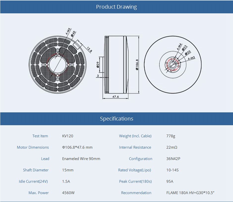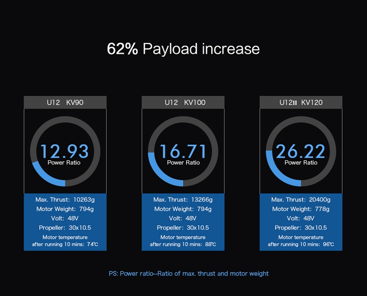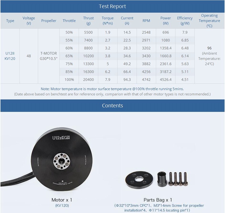 U12Ⅱ KV120 RC Brushless Motor for Airplane Multicopter 10-14S Max. Thrust 20.4kg