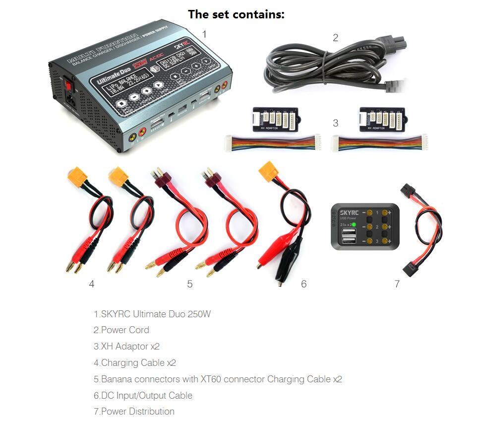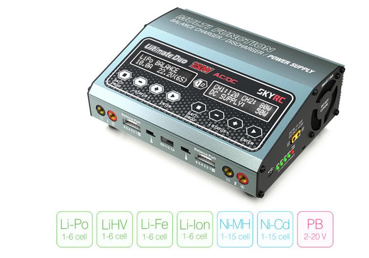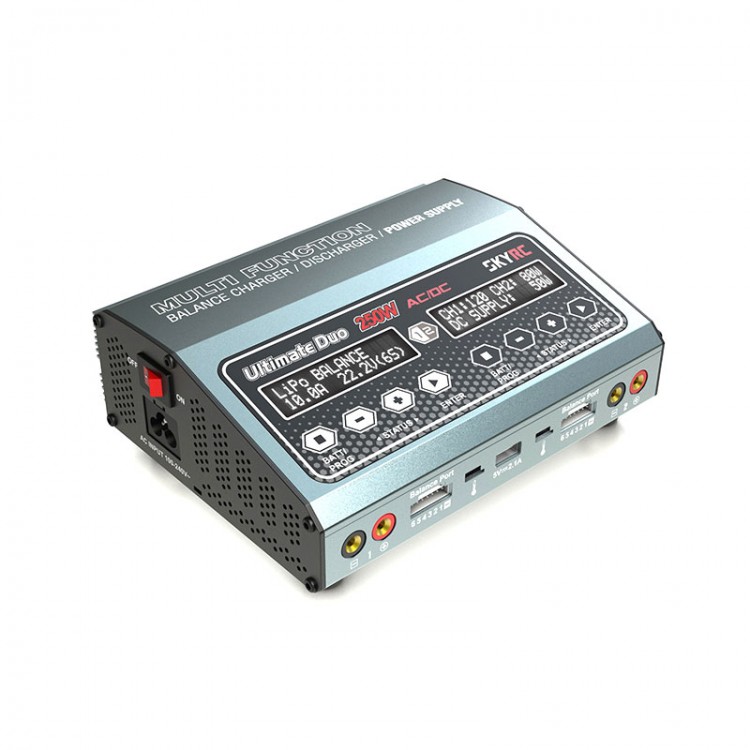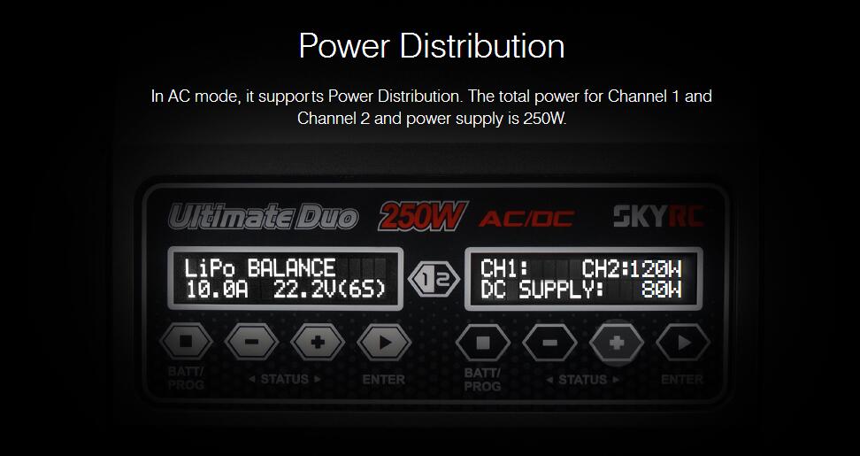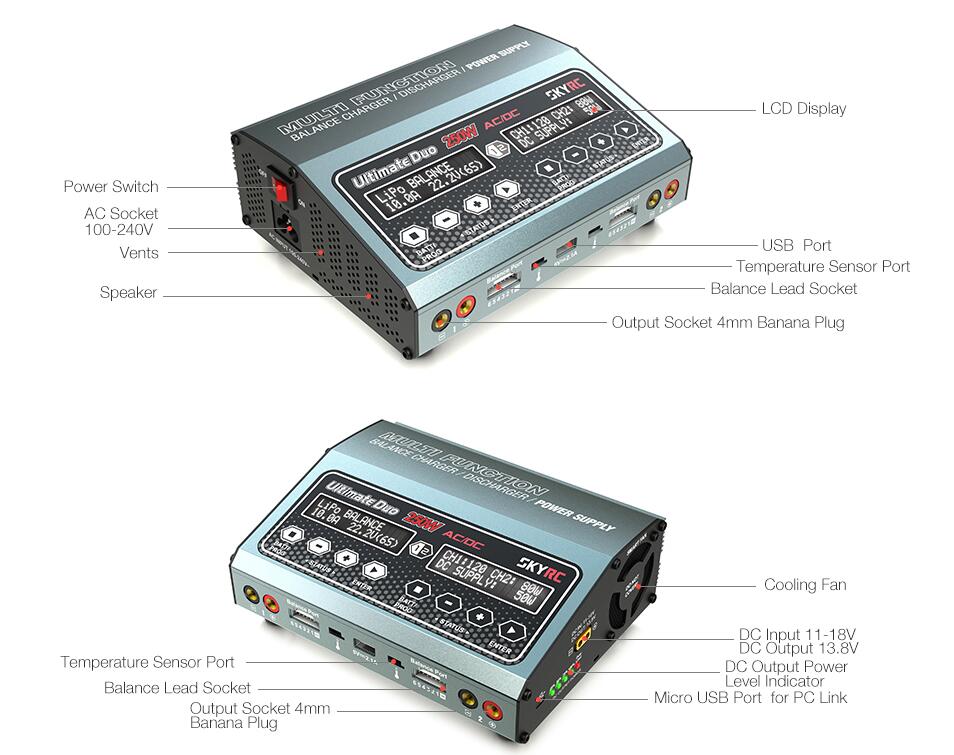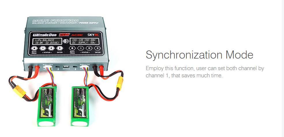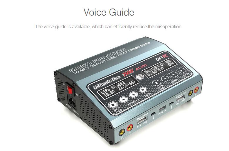 - SkyRC D250 is a twin-channel charger with two independent circuits which can charge two different kinds of batteries simultaneously, the synchronization mode is available, in which users could perform synchronous settings for charging same batteries simultaneously to offer time-saving benefits. What’s more, it can supply Max 150 Watts DC power supply. You can use it to power equipments that requires DC power. It converts standard household power 100-240V AC to 13.8V DC power. Besides that, voice guide is available, which will allow users to enjoy more fun during the using.