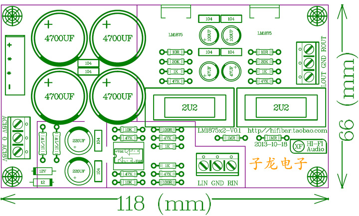- 4*4700UF/35V Rubycon (The limit voltage of LM1875 is 30V )
