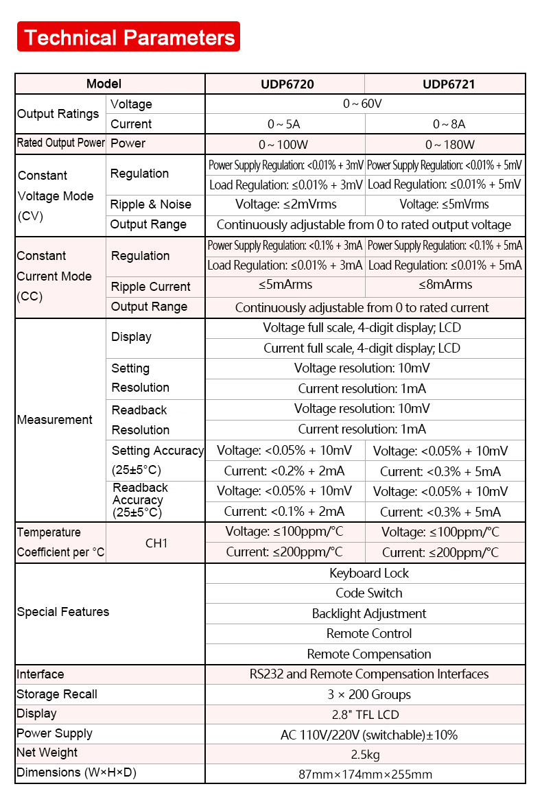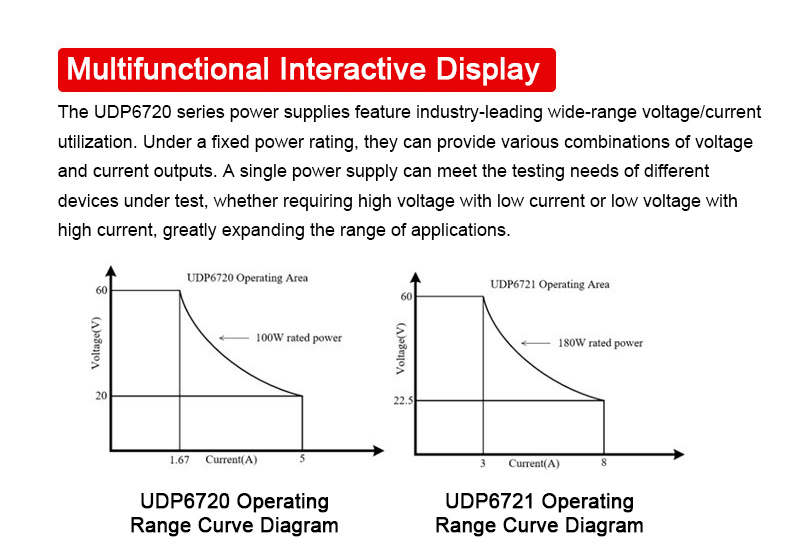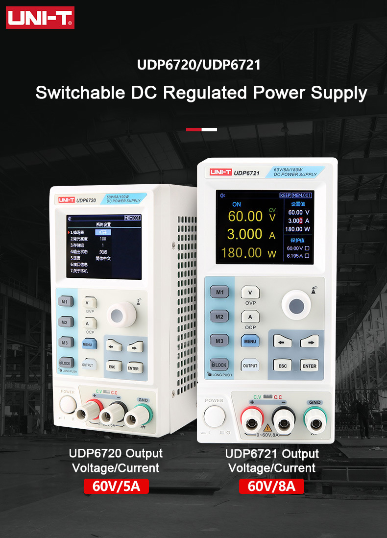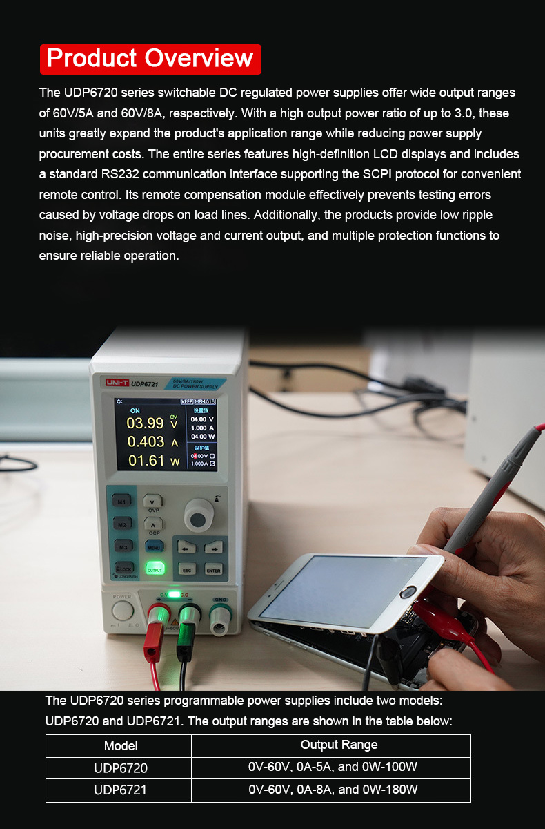 The UDP6720 series switchable DC regulated power supplies offer wide output ranges of 60V/5A and 60V/8A, respectively. With a high output power ratio of up to 3.0, these units greatly expand the product's application range while reducing power supply procurement costs. The entire series features high-definition LCD displays and includes a standard RS232 communication interface supporting the SCPI protocol for convenient remote control. Its remote compensation module effectively prevents testing errors caused by voltage drops on load lines. Additionally, the products provide low ripple noise, high-precision voltage and current output, and multiple protection functions to ensure reliable operation.