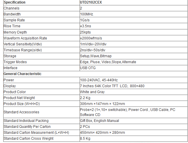 UNI-T UTD2102CEX 100MHZ AC240V Bandwidth 2CH 1GS/s 7inch Digital Storage Oscilloscope OSD with Probe