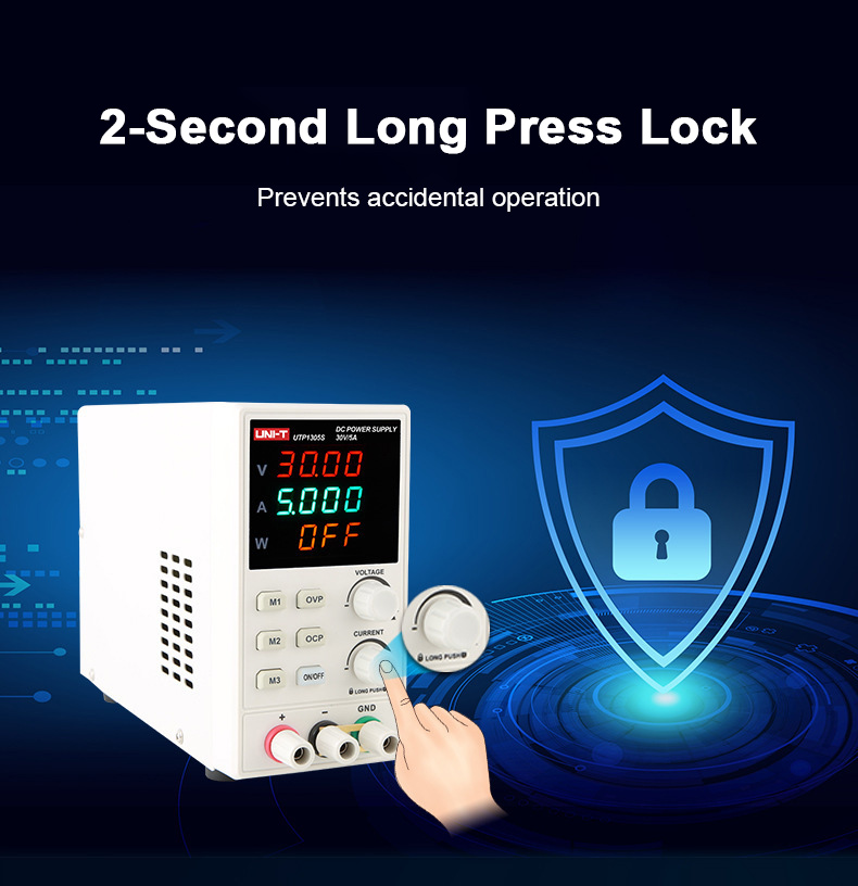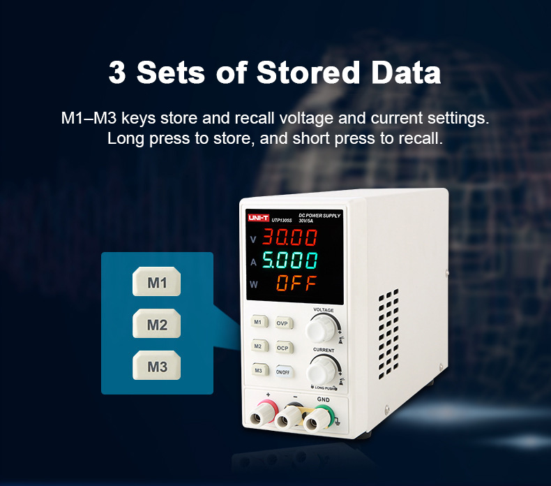 * 3 Sets of Stored Data: M1–M3 keys store and recall voltage and current settings. Long press to store, and short press to recall.