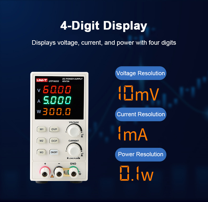* 4-Digit Display: Displays voltage, current, and power with four digits. Voltage Resolution: 10mV; Current Resolution: 1mA; Power Resolution: 0.1W.